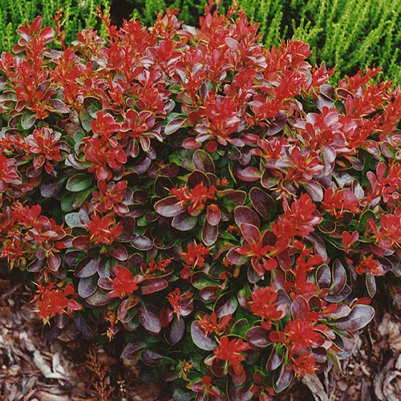 Компактный кустарник с компактной, густой, округлой кроной. Листья небольшие, окрашены в темно-красный-коричневый цвет, осенью преобретают ярко-красный окрас. Плоды созревают в октябре. Кустарник хорошо восстанавливается после обмерзания. Мелкие цветки окрашены в желтый цвет. Наилучшего развития достигает на солнечных участках. Подходит для альпинариев, бордюрных посадок.