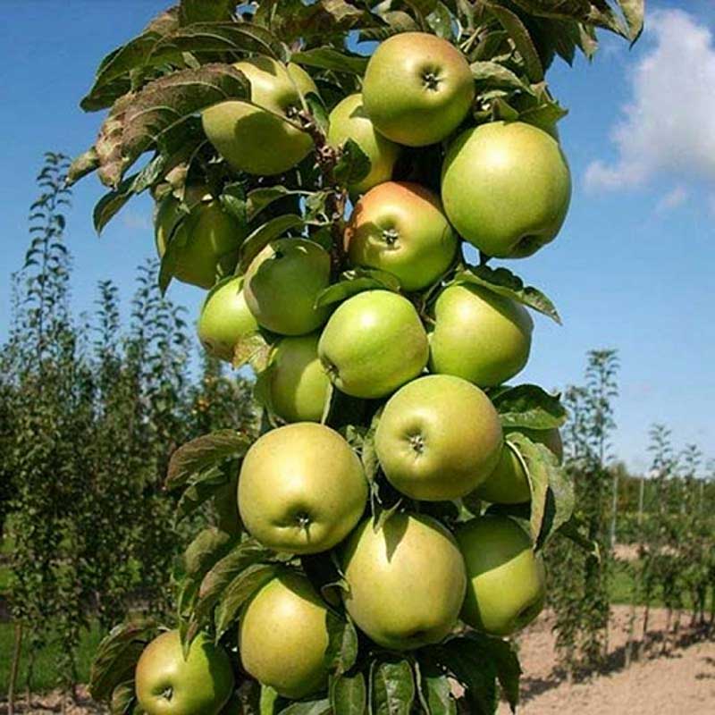 Среднерослое, колоновидное дерево, высотой 2 м. Крона отличается компактными размерами и малыми габаритами. Листья длинные, крупные, темно-зеленого цвета, с глянцевой поверхностью. Плоды крупные, массой 140-250 г, уплощенно-округлой формы. Основной окрас бледно-желтый, с нежным фиолетово-красным румянцем. Кожица тонкая, плотная, блестящая. Мякоть мелкозернистая, белая, сочная, приятного кисло-сладкого вкуса, ароматная. Созревание происходит с конца августа до середины сентября. Морозостойкость, устойчивость к болезням и вредителям - высокая.