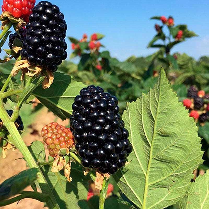 "Компактный сорт, куст вертикальный. Побеги без шипов, высотой до 1,5-2 м., что существенно облегчает уход за растением и сбор урожая. Листья светло-зелёные, цветки – белые. Плоды овальные, крупные – средний вес 6-8 гр. Отдельные ягоды могут достигать 20-25 граммов. Цвет спелой ежевики черный с глянцевым блеском. Мякоть – нежная, сочная. Вкус – десертный. Урожайность сорта — 5-7 кг ежевики с куста, что считается хорошим показателем для «тутаймера». Плодоношение – непрерывное, вплоть до первых холодов. Первая волна ягод созревает в июне на побегах второго года, вторая – в августе на первогодках.