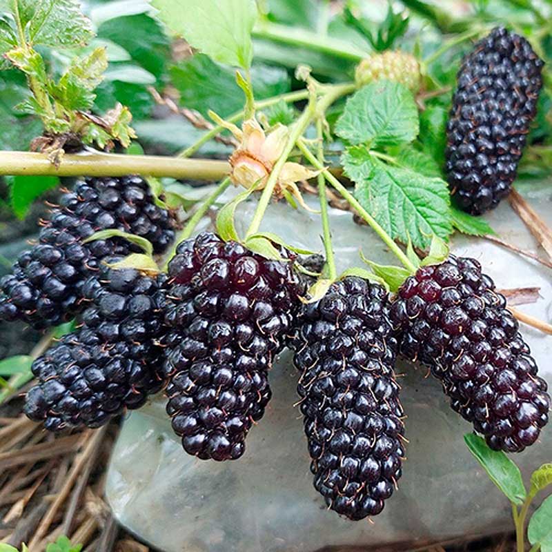 Куст ежевики имеет высоту от 150 до 250 см. Он также характеризуется хорошей облиственностью. Ежевика имеет средний период созревания. Первые ягоды начинают появляться уже в июне, а последние можно увидеть на кусте до конца сентября. Такой длительный период плодоношения позволяет получать обильный урожай на протяжении всего лета. Ежевика Коламбия Гигант отличается хорошей урожайностью. С одного квадратного метра можно получить до 35 кг ягод, а с каждого отдельного куста – от 5 до 8 кг. Ягоды ежевики этого сорта имеют насыщенно-чёрный цвет, что придает им эстетическую привлекательность. Форма ягод коническая, а размер довольно большой – длина более 5 см. Вес каждой ягоды в среднем составляет 12-15 г, но иногда может достигать 23 г. Мякоть ягод твёрдая и сочная. Вкус ежевики сладкий, с ярко выраженным малиновым послевкусием и небольшой кислинкой.