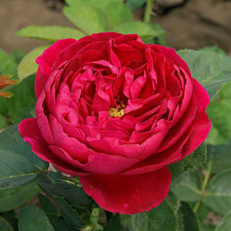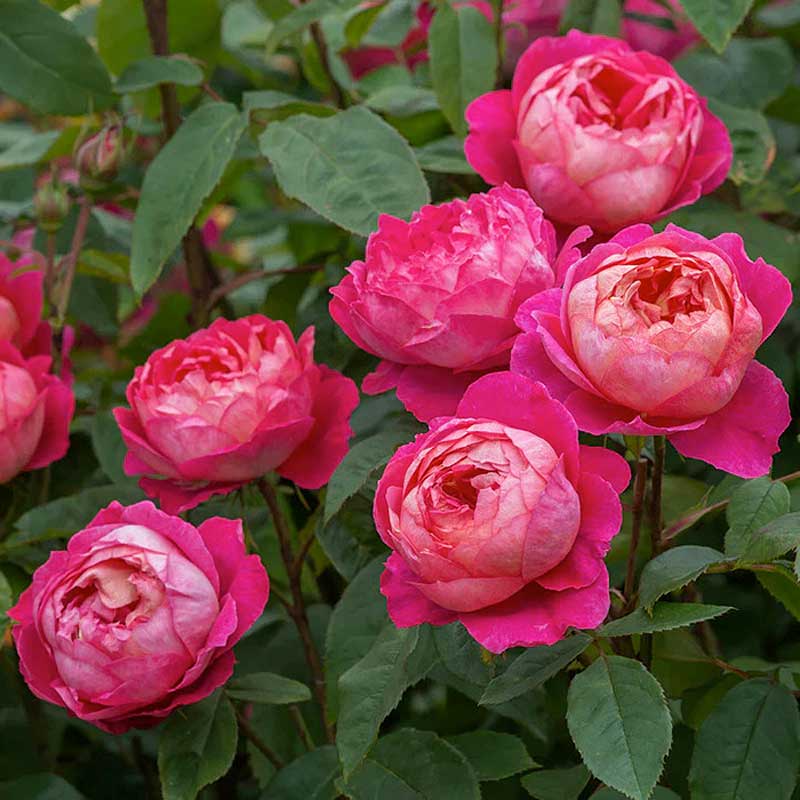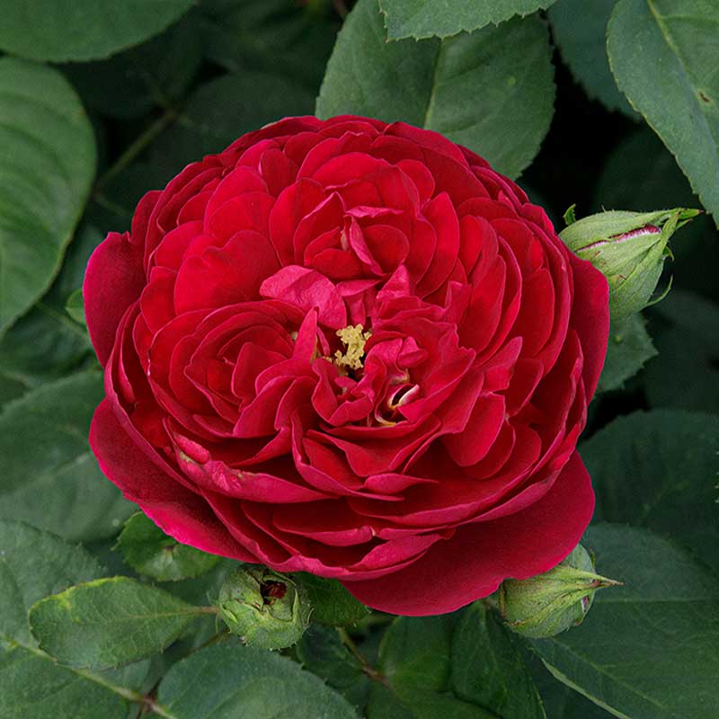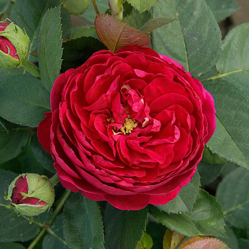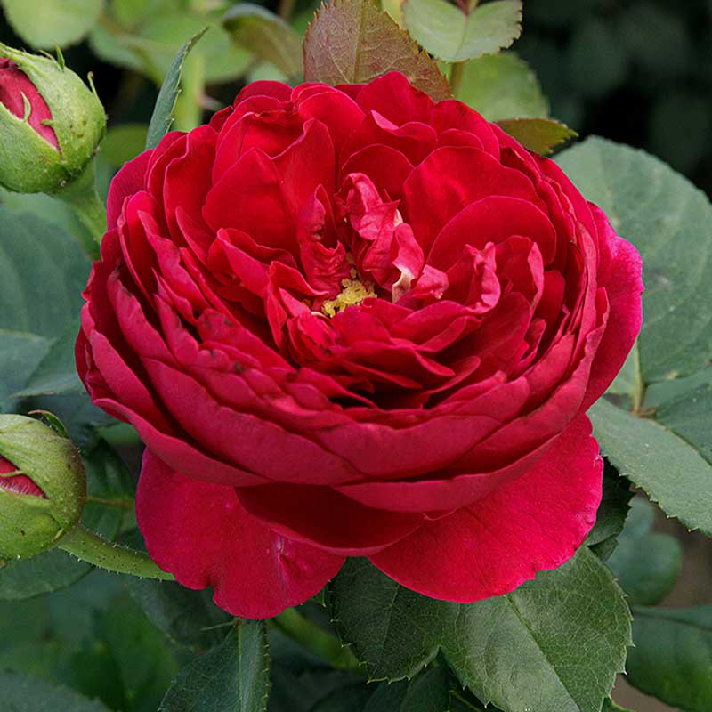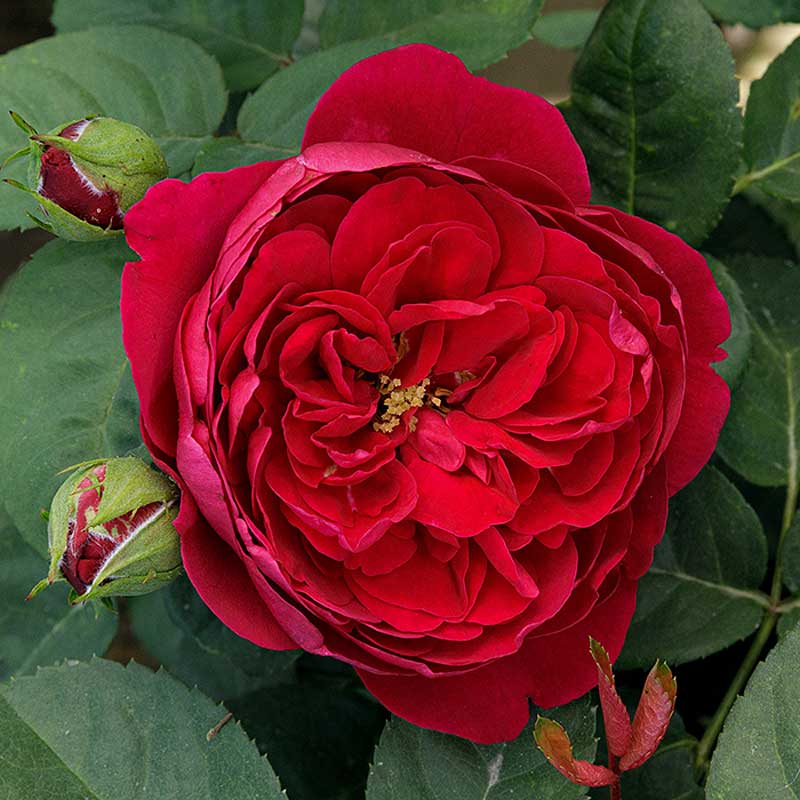 Сорт обладает необычной окраской - красный, с коралловым оттенком. Глубоко чашевидные цветки постепенно раскрываются до открытой, слегка чашевидной розетки. Цветки легкие, густомахровые, средних размеров, обычно с пуговкой в центре. Аромат интенсивный, фруктовый, с оттенком вина и груши. Куст мощный, ветвистый, густооблиственный.