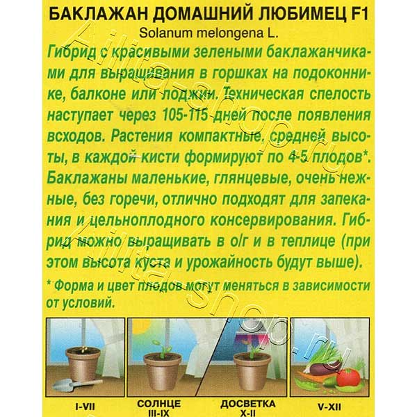 Гибрид с красивыми зелеными баклажанчиками для выращивания в горшках на подоконнике, балконе или лоджии. Техническая спелость наступает через 105-115 дней после появления всходов. Растения компактные, средней высоты, в каждой кисти формируют по 4-5 плодов. Баклажаны маленькие, глянцевые, очень нежные, без горечи, отлично подходят для запекания и цельноплодного консервирования. Гибрид можно выращивать в о/г и в теплице (при этом высота куста и урожайность будут выше).