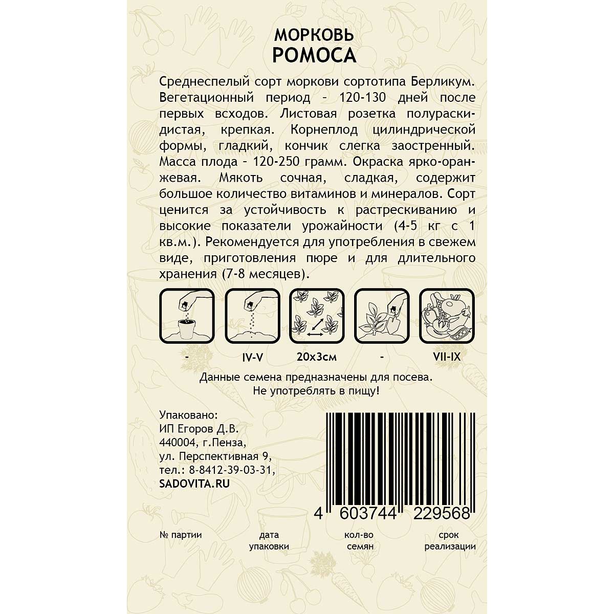 Среднеспелый сорт моркови сортотипа Берликум. Вегетационный период – 120 - 130 после первых всходов. Листовая розетка полураскидистая, крепкая. Корнеплод цилиндрической формы, гладкий, кончик слегка заостренный. Масса плода – 120-250 грамм. Окраска ярко-оранжевая. Мякоть сочная, сладкая, содержит большое количество витаминов и минералов. Сорт ценится за устойчивость к растрескиванию и высокие показатели урожайности (4-5 кг с 1 кв.м.). Рекомендуется для употребления в свежем виде, приготовления пюре и для длительного хранения (7-8 месяцев).