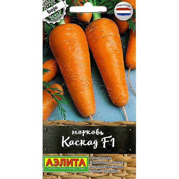 Позднеспелый (120-130 дня от всходов до технической спелости) гибрид. Посев семян в грунт производится в конце апреля – начале мая на глубину 1 см, расстояние между рядками 15 см. Подросшие всходы прореживают, оставляя между растениями по 5-7 см. Розетка листьев полураскидистая. Лист длинный, зеленый, крупнорассеченный. Корнеплод короткий, веретеновидный с заостренным кончиком (сортотип Шантенэ). Сердцевина и кора оранжевые. Масса корнеплода 110-215 г. Вкусовые качества хорошие и отличные. Урожайность 2,5-3,9 кг/м2. Рекомендуется для использования в свежем виде и для длительного хранения.