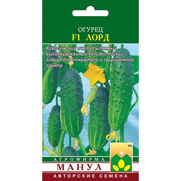 F1 Лорд - урожайный среднеспелый классический пчелоопыляемый гибрид преимущественно женского или женского типа цветения. Широко выращивается в весенне-летнем обороте в открытом и защищенном грунте. Ветвление среднее или выше среднего. Характерной особенностью гибрида является интенсивный рост основной плети и быстрое появление боковых побегов, с отрастанием которых наступает пик массового продолжительного плодоношения. Холодостойкость и устойчивость растений к фитозаболеваниям способствуют высокой урожайности и в конце августа — сентябре — в некомфортных для многих сортов условиях. В узлах формируется по 1-2 завязи. Зеленцы красивой ярко-зеленой окраски, крупнобугорчатые белошипые, длиной 10-12 см; засолочные, консервные и вкусовые качества очень высокие. Гибрид устойчив к мучнистой росе, оливковой пятнистости, вирусу обыкновенной огуречной мозаики, толерантен к ложной мучнистой росе. К F1 Лорд добавляют 10 % опылителя.