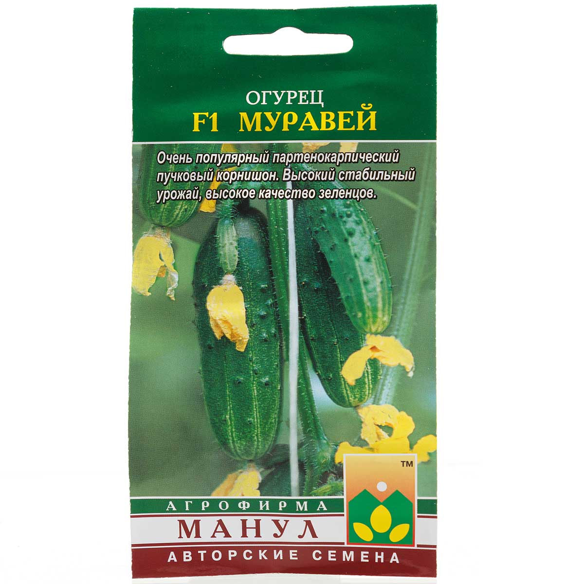 Огурец F1 Муравей - очень скороспелый партенокарпический пучковый корнишонный гибрид женского типа цветения для открытого грунта, теплиц, тоннелей. В плодоношение вступает на 37-38-й день от всходов. Ветвление ограничено (короткие боковые побеги). В узлах формируется от 2-3 до 5-7 завязей. Чем выше освещенность, тем становится больше завязей. Зеленцы крупнобугорчатые, белошипые, длиной 8-11 см, засолочные, вкусовые и консервные качества очень высокие. Активное образование зеленцов благодаря сильной партенокарпии наблюдается с самых нижних узлов стебля практически при любых погодных условиях. Гибрид устойчив к мучнистой росе, оливковой пятнистости, вирусу обыкновенной огуречной мозаики, толерантен к ложной мучнистой росе.