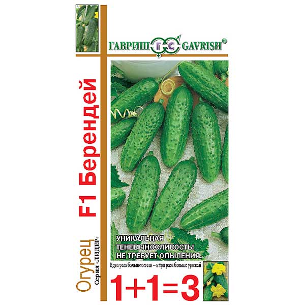 Скороспелый (45-50 дней от всходов до плодоношения) партенокарпический гибрид женского типа цветения для выращивания в пленочных теплицах. В пазухе листа образуется по 4 завязи. Зеленец небольшой, с плотной мякотью и нежной кожицей, длиной 12-14 см, массой 120-130 г, частобугорчатый, белошипый, без горечи. Окраска плодов темно-зеленая, с короткими светлыми полосами. Использование плодов универсальное (засолка, маринование, приготовление свежих салатов). Гибрид устойчив к настоящей мучнистой росе и корневым гнилям. Обладает уникальной теневыносливостью, прекрасно подходит для выращивания на подоконнике, балконе, лоджии. С одного растения можно получить ведро (около 8 кг!) великолепных хрустящих огурчиков. Посев на рассаду — в конце апреля. Высадка рассады в грунт — в конце мая – начале июня в фазе 3-4-х настоящих листьев по схеме 50х50 см. Посев непосредственно в теплицу — в середине мая.