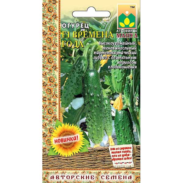 Огурец F1 Времена года - скороспелый партенокарпический гибрид салатного назначения для летне-осеннего и весенне-летнего оборотов. Растения сильнорослые, женского типа цветения, ветвление сильное. В узлах формируется от 1-2 до 3-4 завязей. Партенокарпия высокая. Зеленцы бугорчатые, белошипые, длиной 14-16 см, без шейки, диаметром 3,2-4,1 см, массой 120-150 г. Бугорки крупные, частота расположения бугорков средняя. Поверхность зеленцов ярко-зеленой окраски с короткими светлыми продольными полосами. Мякоть сочная, плотная, ароматная. Гибрид устойчив к мучнистой росе, оливковой пятнистости, вирусу обыкновенной огуречной мозаики, толерантен к ложной мучнистой росе.