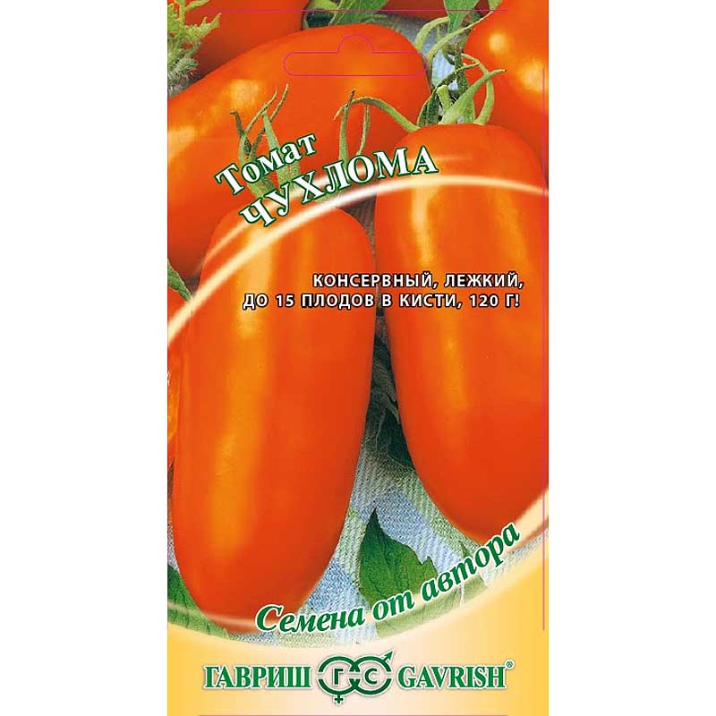 Томат Чухлома: Среднеспелый (111-115 дней) высокорослый (более 2,0 м) сорт для теплиц. В кисти формируется 12-15 банановидных плодов оранжевого цвета, длиной 10-12 см, массой 110-120 г, с повышенным содержанием каротина в мякоти. Плоды прочно прикреплены, не осыпаются, хранятся 2-3 недели. Благодаря плотной мякоти и прочной кожице идеальны для цельноплодного консервирования. Сорт устойчив к ВТМ, фузариозу, кладоспориозу. Выращивают рассадным способом. После высадки растения формируют в один стебель, удаляя все «пасынки».