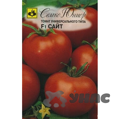 Раннеспелый гибрид Сайт . От полных всходов до начала плодоношения 85-90 дней. Растение супердетерминантное, высотой 55-60 см, компактное, среднеоблиственное, средневетвистое. Соцветие простое с 5-6 цветками. Плоды округлые, гладкие, массой 120-130 г, без зелёного пятна у плодоножки, однородной красной окраски. Плоды очень плотные и транспортабельные. Вкусовые качества отличные. Густота посадок в плёночных теплицах 3 раст./м2 с формированием в 2-3 стебля; в открытом грунте – 5 раст./м2. Устойчив к вирусу табачной мозаики, бактериозу, альтернариозу, фузариозу, толерантен к фитофторозу. Урожайность Сайт F1 в открытом грунте 9,0-10,0 кг/м2, в плёночных теплицах 13,5-15 кг/м2.