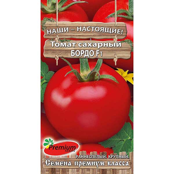 Раннеспелый гибрид (от всходов до плодоношения 87-90 дней), детерминантный (высота 70-75 см), для выращивания в открытом грунте и в теплицах. Плоды гладкие, крупные, 140-150г, мясистые, сахарные, без "косточки" внутри. Суперсладкие и ароматные, округлые, тёмно-красные, без жёлтого пятна у плодоножки, все выровненные по форме и размеру. Обладает устойчивостью к основным болезням томата.Агротехника:На рассаду семена высевают в начале марта на глубину 1-1,5 см. Пикировка - в фазе 1-2 настоящих листьев. Подкормка рассады 2-3 раза комплексным удобрением. Высадка рассады в возрасте 50-55 дней. Густота посадки - 4-5 растения на 1м2. Необходимо подвязывать, удалять пасынки и формировать растения в два стебля.