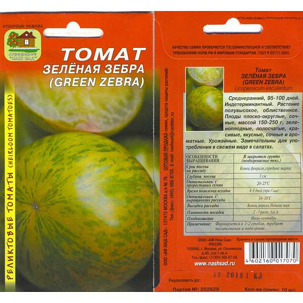 Среднеранний, 95-100 дней. Индетерминантный. Растение полувысокое, облиственное. Плоды плоско-округлые, сочные, массой 150-250 г, зеленоплодные, полосчатые, красивые, вкусные, сочные и ароматные. Урожайные. Замечательны для употребления в свежем виде и салатах.