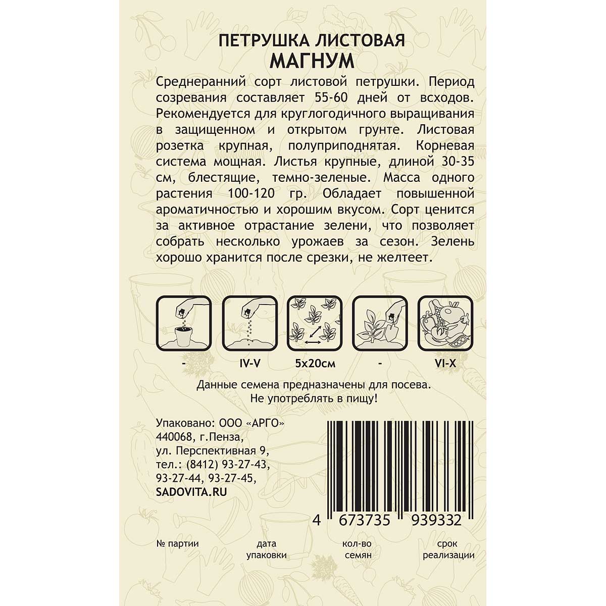 Среднеранний сорт листовой петрушки. Период созревания составляет 55-60 дней от всходов. Рекомендуется для круглогодичного выращивания в защищенном и открытом грунте. Листовая розетка крупная, полуприподнятая. Корневая система мощная. Листья крупные, длиной 30-35см, блестящие, темно-зеленые. Масса одного растения 100-120 гр. Обладает повышенной ароматичностью и хорошим вкусом. Сорт ценится за активное отрастание зелени, что позволяет собрать несколько урожаев за сезон. Зелень хорошо хранится после срезки, не желтеет.