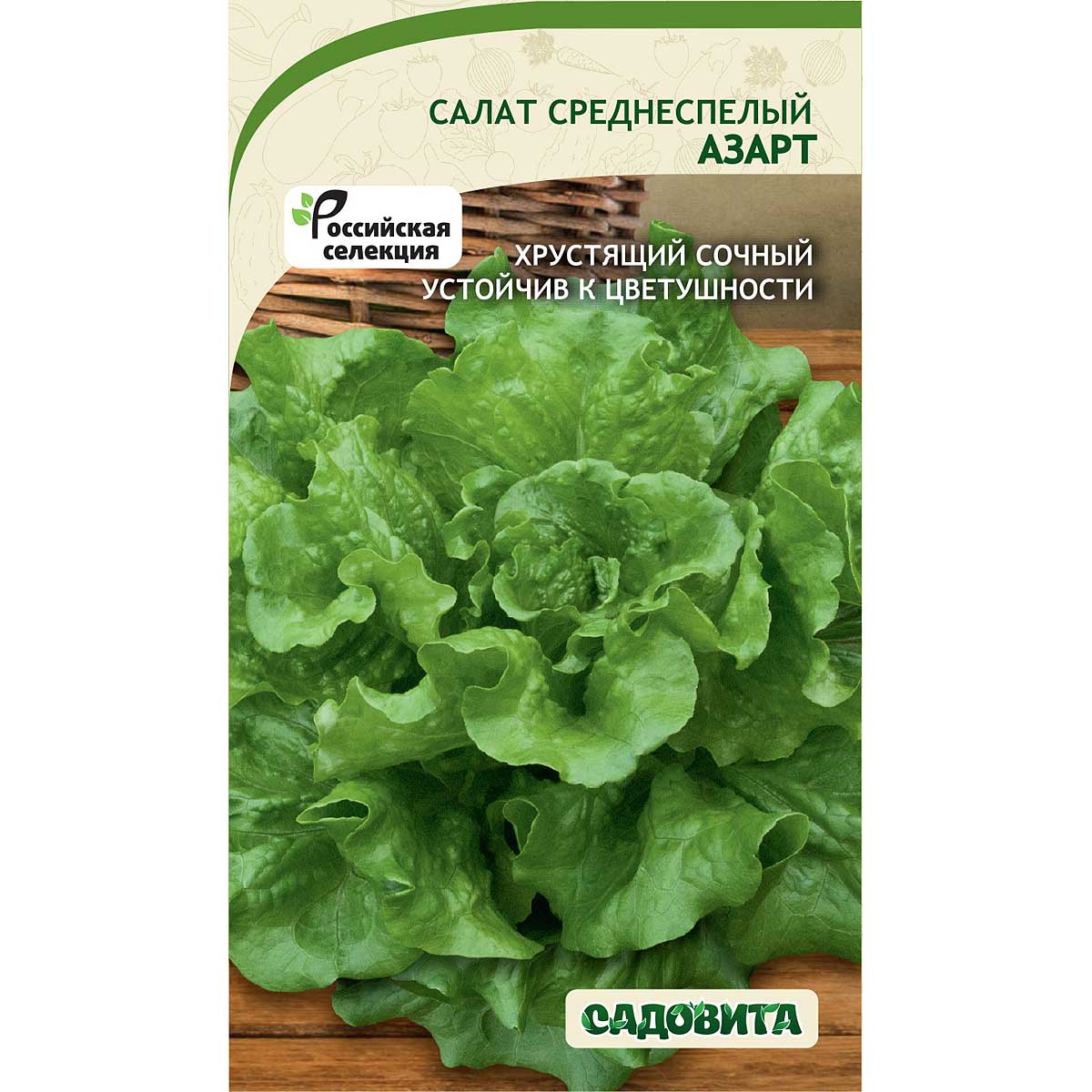 Среднеспелый сорт листового салата. Срок созревания составляет 60-65 дней от всходов. Возможно выращивание в открытом и закрытом грунте. Листовая розетка приподнятая, пышная, диаметром до 30 см. Листья веретенообразные с волнистым краем, светло-зеленые, хрустящие. Вкус хороший, освежающий. Масса одного растения 300-350 гр. Сорт устойчив к цветушности. Подходит для употребления в свежем виде и для украшения блюд. Урожайность хорошая – 3-4 кг с 1 кв.м.