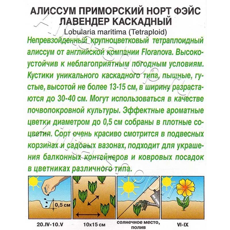 Высокоустойчив к неблагоприятным погодным условиям. Кустики уникального каскадного типа, пышные, густые, высотой не более 13-15 см, в ширину разрастаются до 30-40 см. Могут использоваться в качестве почвопокровной культуры. Эффектные ароматные цветки диаметром до 0,5 см собраны в плотные соцветия. Сорт очень красиво смотрится в подвесных корзинах и садовых вазонах, подходит для украшения балконных контейнеров и ковровых посадок в цветниках различного типа.