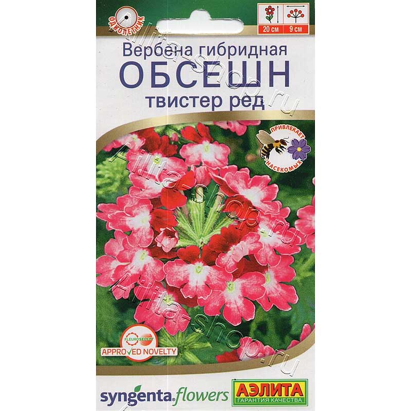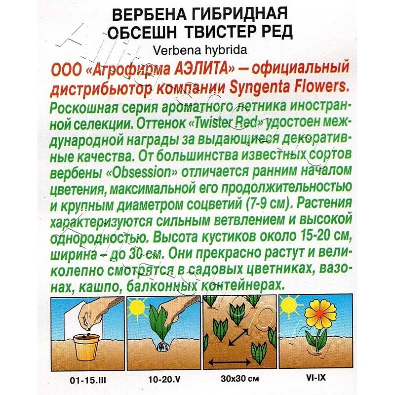 Роскошная серия ароматного летника иностранной селекции. Оттенок «Twister Red» удостоен международной награды за выдающиеся декоративные качества. От большинства известных сортов вербены «Obsession» отличается ранним началом цветения, максимальной его продолжительностью и крупным диаметром соцветий (7-9 см). Растения характеризуются сильным ветвлением и высокой однородностью. Высота кустиков около 15-20 см, ширина – до 30 см. Они прекрасно растут и великолепно смотрятся в садовых цветниках, вазонах, кашпо, балконных контейнерах.