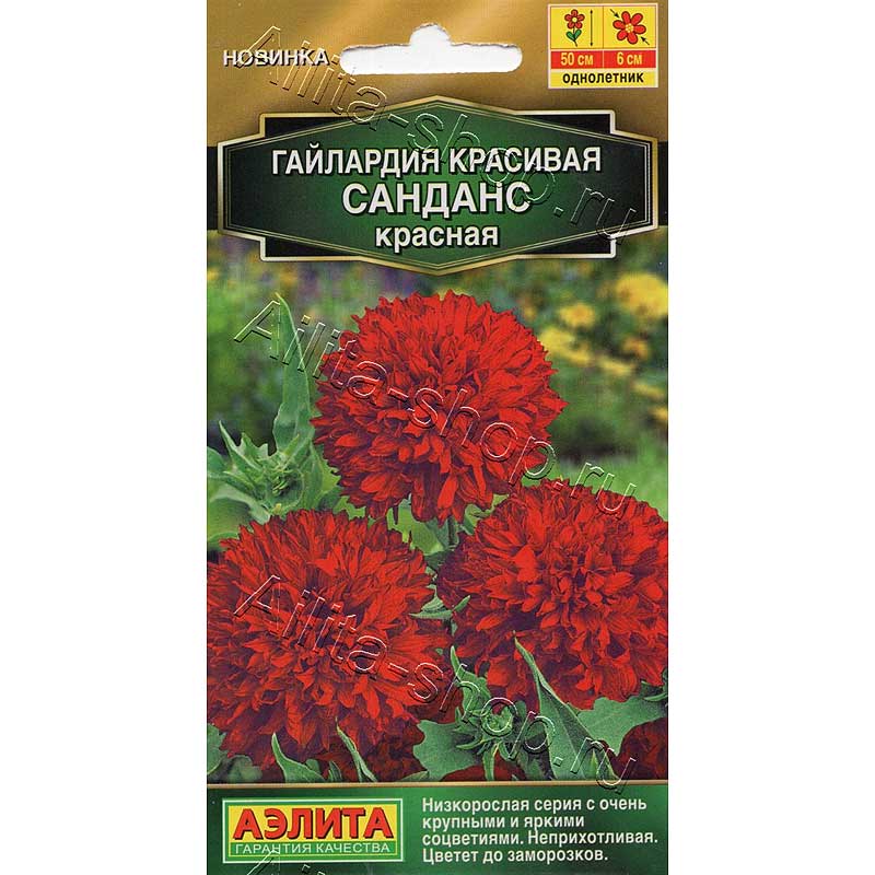 Новая серия низкорослой однолетней гайлардии "Санданс" (Sundance) европейской селекции. Высокоустойчива к капризам по годы. Неприхотлива и очень декоративна до осенних заморозков. На протяжении лета растения непрерывно образуют пышные махровые шаровидные соцветия Ø 5-6 см. Компактные кустики высотой около 40- 50 см эффектно выглядят при высадке группами в рабатках и бордюрах. Это великолепная срезочная и горшечная культура, надолго сохраняющая прекрасный облик.