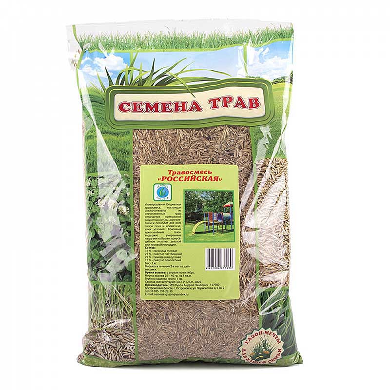 Семена газонной травосмеси. Универсальная бюджетная травосмесь, состоящая исключительно из отечественных трав. Газон отличается прекрасной зимостойкостью, долголетием и подходит для всех видов почв и климатических условий. Красивый ярко-зеленый газон выдержит умеренные нагрузки на приусадебном участке, детской или игровой площадке. Состав: овсяница луговая – 35%, райграс пастбищный – 25%, тимофеевка луговая – 25%, райграс однолетний – 15%.