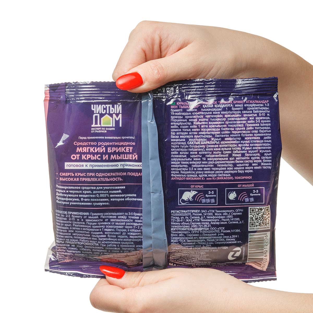 Высокоэффективная готовая к применению приманка с мумифицирующим эффектом в виде мягкого брикета. Применяется населением в быту для уничтожения серых и черных крыс, домовых мышей, полевок и других мышевидных грызунов. Приманка содержит горькую добавку «битрекс», предотвращающую случайное съедение приманки человеком или домашними животными (кроме грызунов). В качестве действующего вещества используется – бродифакум (0,005%). Бродифакум – антикоагулянт из группы кумаринов, применяется в качестве родентицида против всех видов грызунов. Действует даже после однократного приема. На 3-6 день после поедания приманки грызуны начинают испытывать удушье, у них начинается внутреннее кровотечение, в следствие которого, на 4-10 день они погибают.