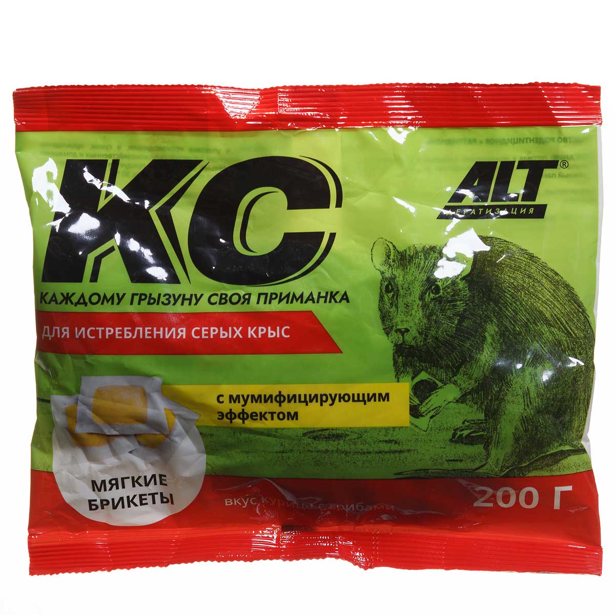 Действующее вещество: Бромадиолон. В состав мягких брикетов, помимо действующего вещества, входят как привлекатели свежее тесто с сыром, подсолнечное масло и ваниль, каждый брикет отдельно завернут в съедобную рисовую бумагу – это обеспечивает исключительную привлекательность и 100 % поедаемость приманки крысами, а содержащиеся в составе добавки, отпугивающие животных – уменьшают вероятность потребления приманки нецелевыми животными. Постепенное развитие симптомов отравления не вызывает у крыс настороженного отношения к брикетам, что позволяет предотвратить избегания приманки грызунами.