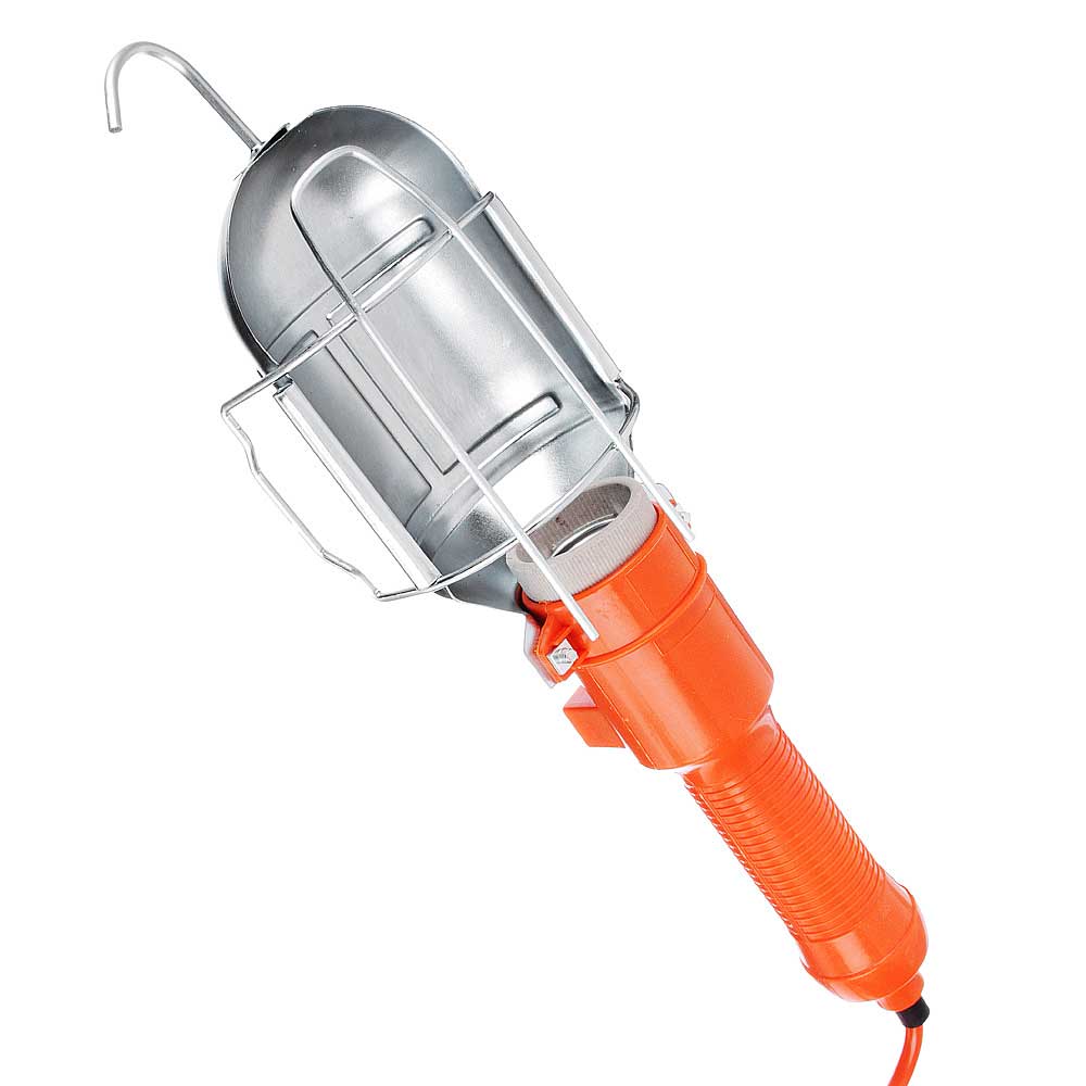 Переносная лампа. Удобна на стройке, когда делают ремонт, в автомастерских. Длина кабеля 10 метров. Выключатель на ручке - не нужно идти к розетке, чтобы выключить лампу. Ручка пластиковая. Лампочка защищена металлическим кожухом с крупной решеткой - предотвращает удары и не мешает свету. Мощность 60 Вт. С крюком, чтобы подвешивать лампу.