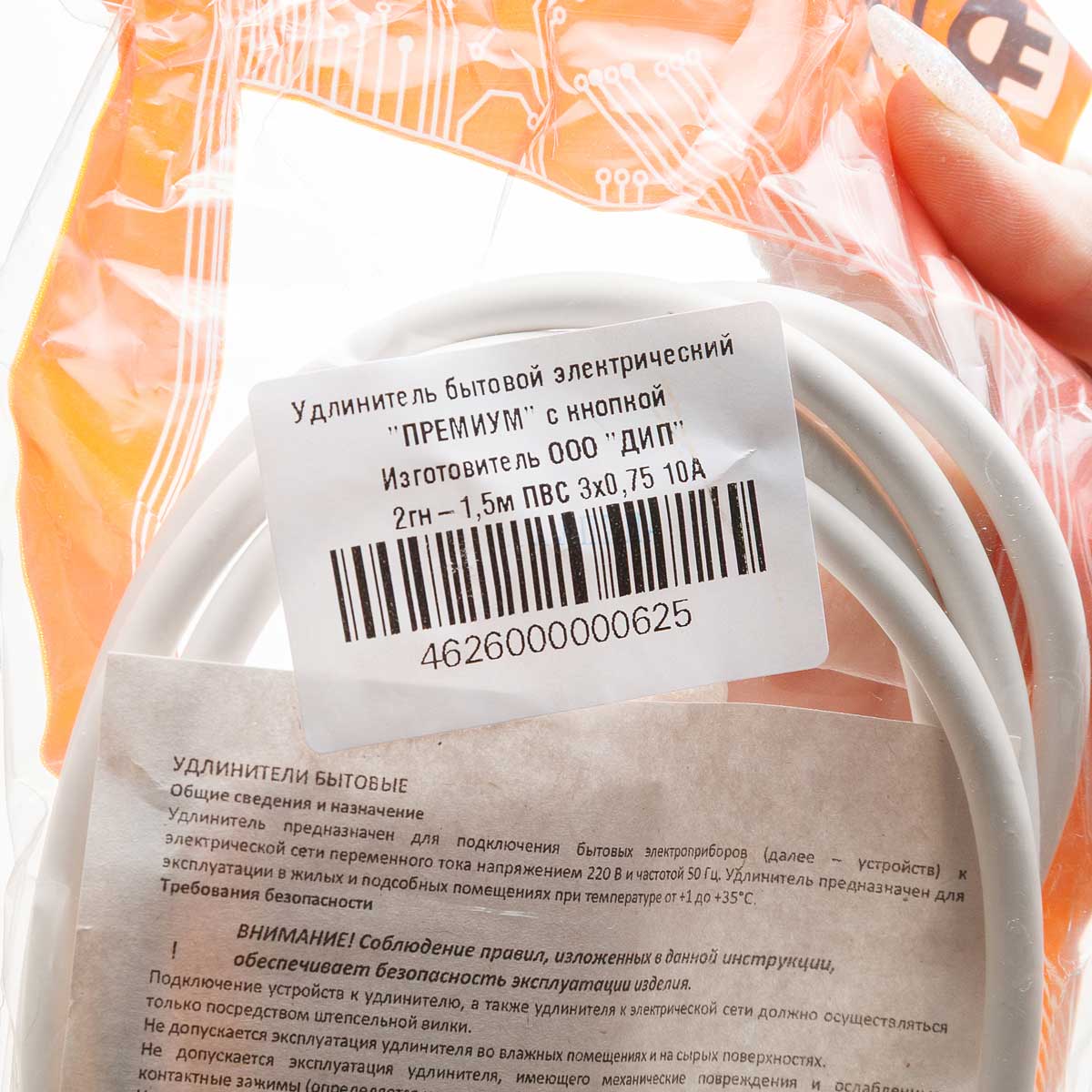 Компактный бытовой удлинитель премиум с кнопкой на 2 гнезда 1,5 метра ПВС 3*0,75 с заземлением, цвет белый. Рассчитан на одновременное подключение к розетке до двух электроприборов. Длина шнура 1,5 метра. Корпус изготовлен из прочного негорючего полипропилена с защищающими от возгорания антипиренами. Белый цвет. Удлинитель отличается аккуратным приятным дизайном.