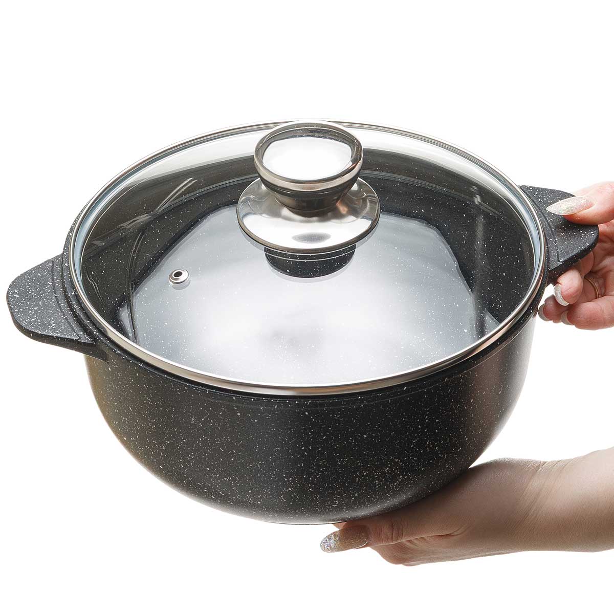 Кастрюля из литого алюминия подходит для ежедневного приготовления разнообразных блюд. Изделие произведено в соответствии со строгими нормами технического контроля. Особенности: покрытие Greblon C2+ защищает от пригорания; удобные ручки облегчают хват; кастрюля имеет стеклянную крышку с пароотводом; поверхность изделия легко отмывается; благодаря качественной проточке дно прогревается максимально быстро. Кастрюлю можно мыть в посудомоечной машине. Объем 4л.