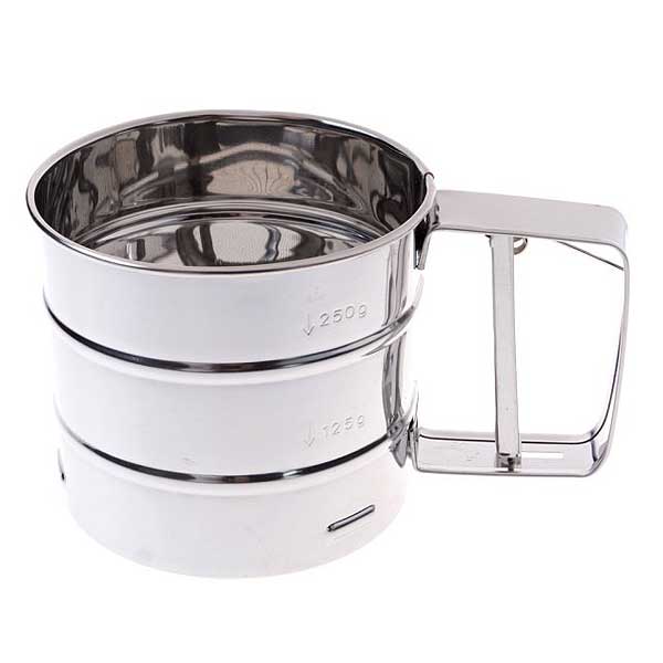 Кружка-сито - ёмкость для просеивания муки, сахарной пудры, манки, какао и других мелких сыпучих продуктов. Кружка состоит из корпуса с двойным ситовым дном и ручки, внутри которой находится пружина. Благодаря ручке-рычагу вы с легкостью просеете муку, без труда потом очистите изделие от остатков.