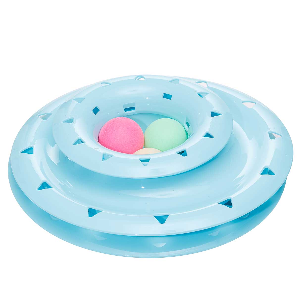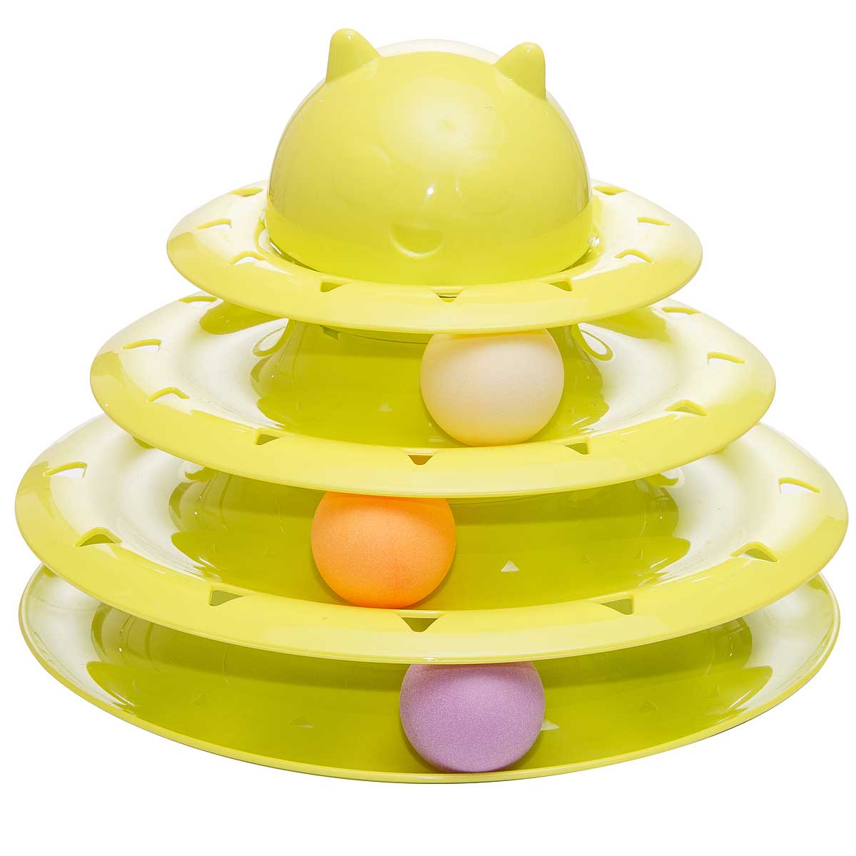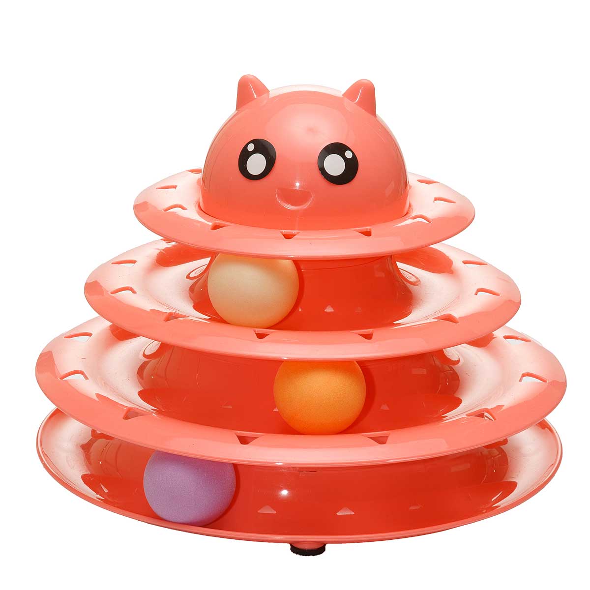 Игрушка для животных Пирамидка с мячами - яркий мячик катается по кругу, что очень привлекает внимание кошки. Оторваться невозможно! Как ни стараешься - всё равно не поймаешь, но и не потеряешь. А если мячики еще и на разных уровнях... немного сноровки и можно играть одновременно со всеми. Прочная и устойчивая конструкция. Противоскользящие прокладки на дне конструкции. Крупная игрушка не затеряется за мебелью.