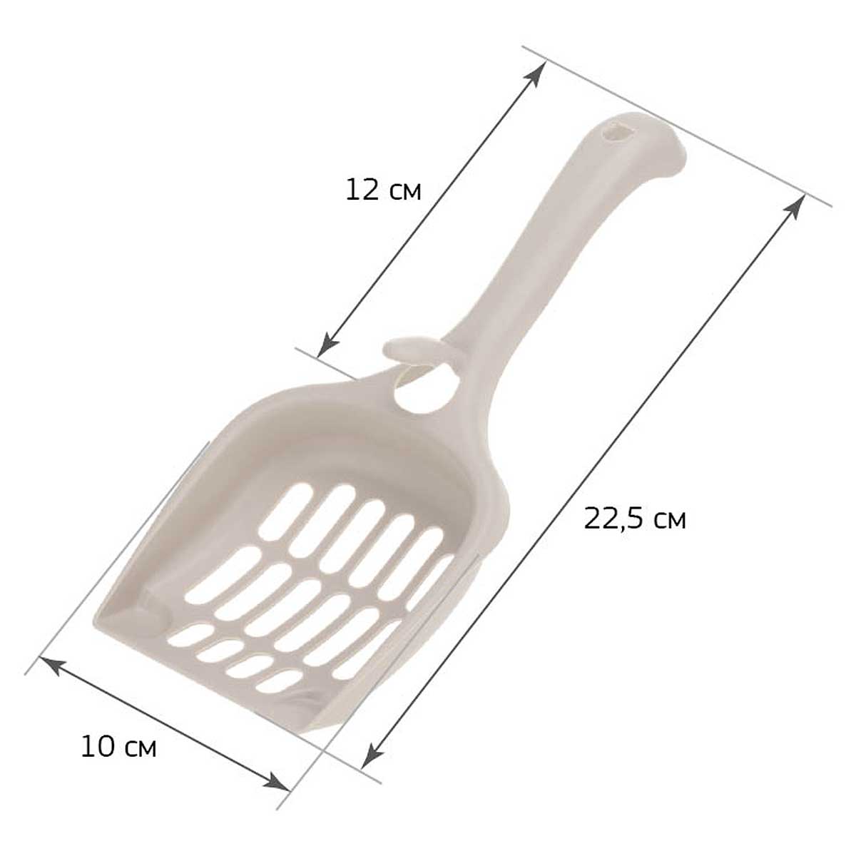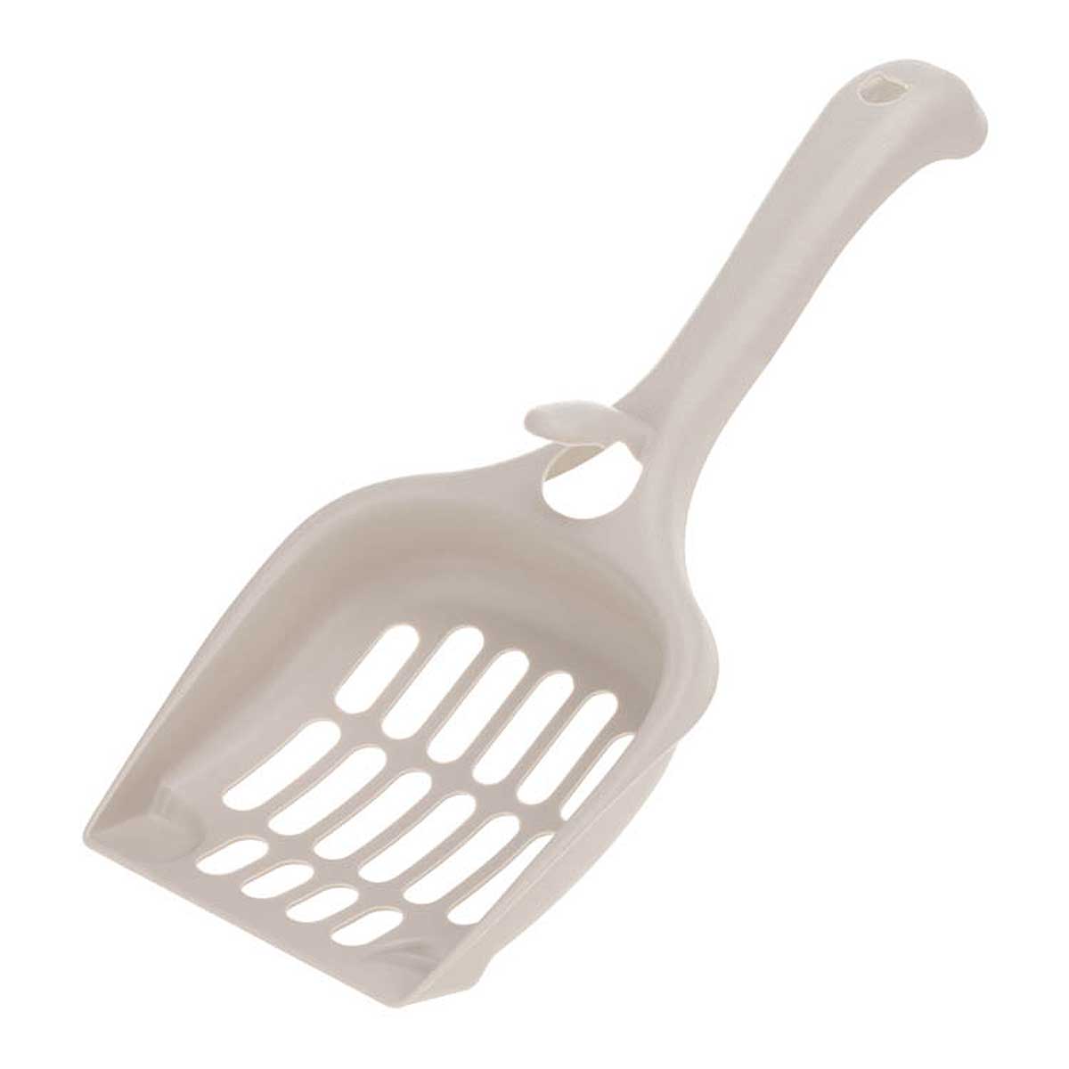 Совок необходим для уборки кошачьего туалета. Он компактен и имеет небольшой вес. У совка есть крючок для его крепления на рамку лотка для кошек. Благодаря его особой конструкции совок можно разместить на узкий и широкий край, на внешнюю и внутреннюю поверхность.