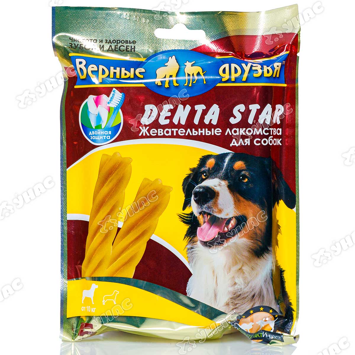 Жевательные лакомства Дента Стар (крученая звезда) для собак весом от 10 кг способствуют поддержанию зубов и десен в здоровом состоянии, содержат минеральные вещества и витамины, отлично укрепляют десны и очищают зубы от вредного налёта и зубного камня. Не содержат красителей и ГМИ. Состав: кукурузный крахмал, мука пшеничная, глицерин, печеночный экстракт, жир куриный, витамины: А, Д, Е, тиамин В1, рибофлавин В2, холин В4, кальция пантотенат В5, пиридоксин В6, фолиевая кислота В9, цианокобаламин В12, фосфат кальция, цинк, селен, фосфор, антиоксиданты. Пищевая ценность: сырой белок 5%, сырой жир 3%, сырая зола 4,5 %, клетчатка 2,5%, влага 12 %, кальций 0,8%, фосфор 0,4%. Рекомендации по применению: не является основным питанием.
