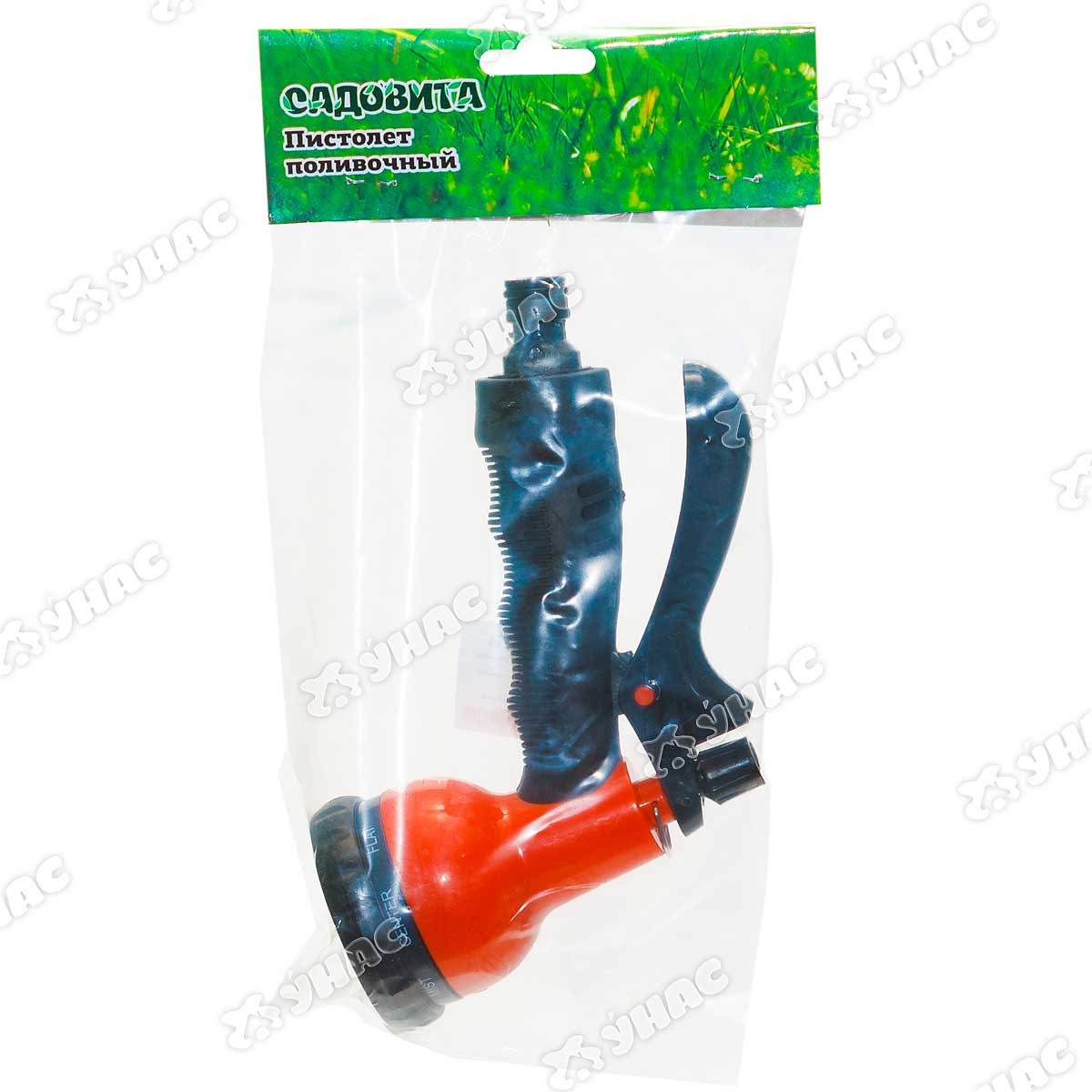 Душ-пистолет для полива, 6 режимов, ударопрочный пластик, обрезиненная рукоять, курок сзади рукояти с регулятором напора и фиксатором, система быстрой фиксации.