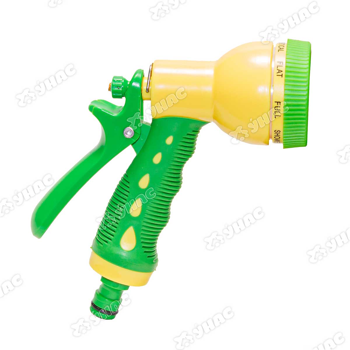 Душ-пистолет для полива, 6 режимов, ударопрочный пластик, обрезиненная рукоять, курок сзади рукояти с регулятором напора и фиксатором, система быстрой фиксации.