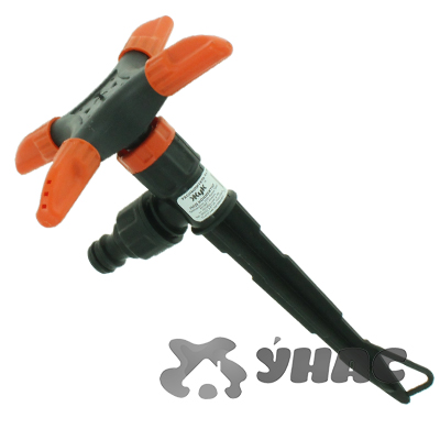 Распрыскиватель-вертушка на колышке, четыре леспестка с регулируемыми соплами, система быстрого соединения.