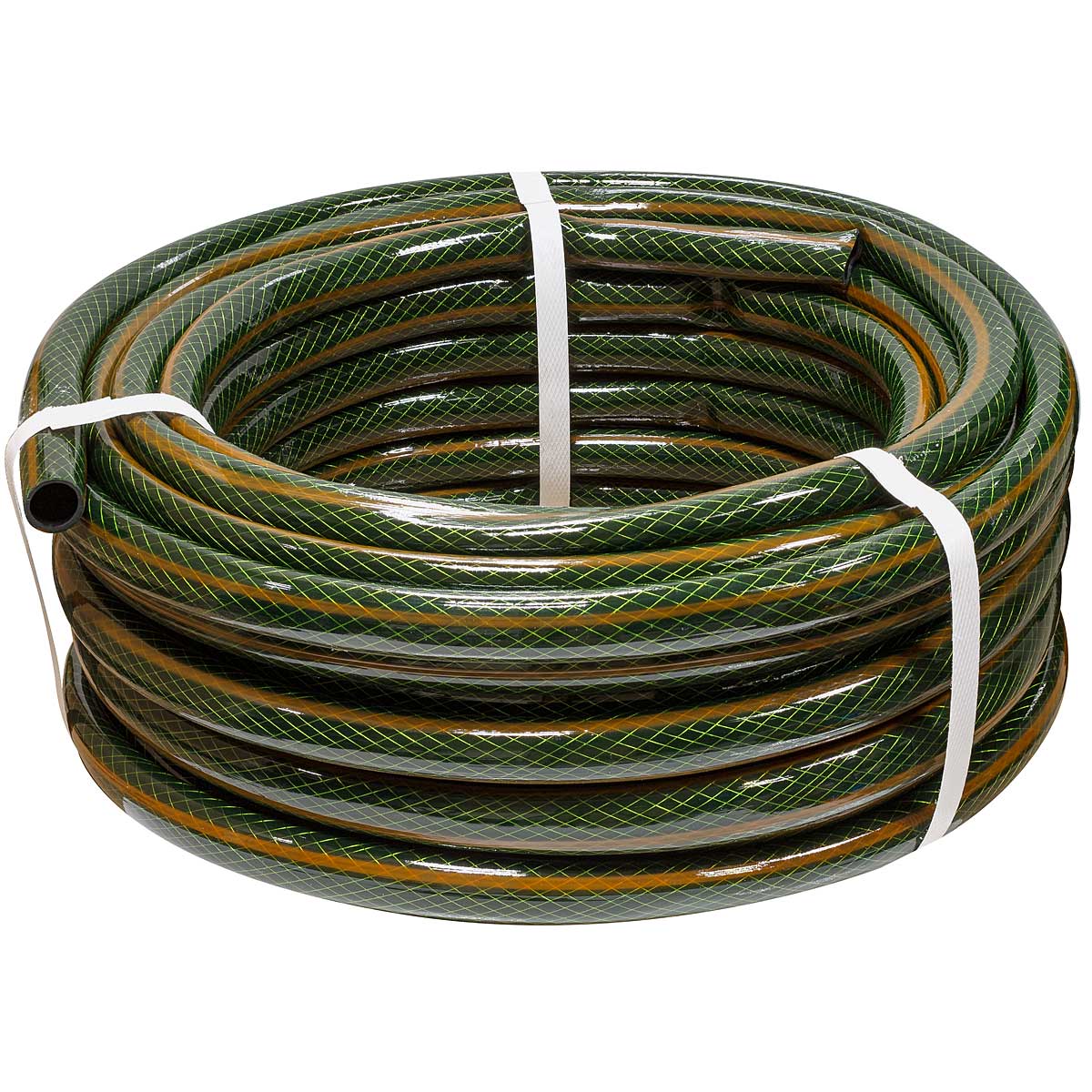 Трехслойный, армированный высокопрочной синтетической нитью шланг. Внутренний слой ПВХ непрозрачный, черный, защищает от проникновения солнечных лучей и препятствует образованию водорослей внутри тела шланга. Наружный ПВХ слой прозрачный, окрашенный в зеленый цвет. При производстве используют специальные защитные добавки от воздействия внешних факторов, таких как ультрафиолетовое излучение, истирание. Между внутренним и наружным ПВХ слоями проложен высокопрочный плетеный корд из высокопрочной синтетической нити. Благодаря повышенным качественным показателям этот вид шланга имеет более высокие эксплуатационные характеристики (не заламывается и не перегибается). Предназначен для полива, перекачки и прочих работ с жидкостями, в том числе с пищевыми.