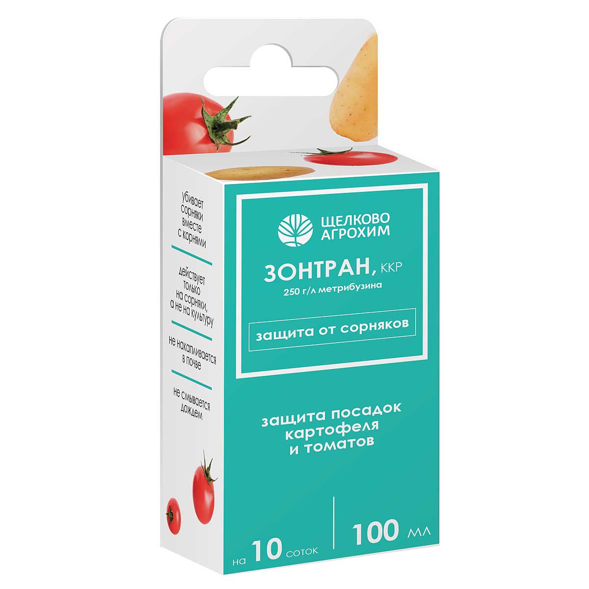 Средство от сорняков «Зонтран, ККР» – контактный гербицид для уничтожения широкого спектра двудольных и злаковых сорняков на посевах картофеля и томатов. Уничтожает более 50 видов сорняков и образует защитный экран, не смываемый дождем. Препарат поглощается листьями и корневой системой прорастающих сорняков, угнетает чувствительные сорняки. Видимые симптомы воздействия на сорняки — через 2–7 дней, гибель сорняков – через 10-15 дней после опрыскивания. Обеспечивает чистоту посадок от чувствительных сорняков на один месяц.