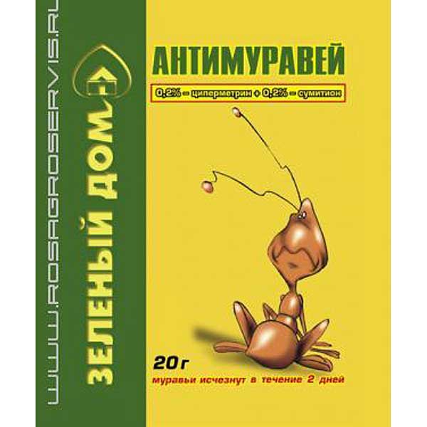 Антимуравей от российского производителя МосАгро. Это средство для борьбы с черными, рыжими, домовыми муравьями и другими ползающими насекомыми. В состав входит дельтаметрин 0.05%, борная кислота 1%. Препарат используется в жилых помещениях, на садовых участках, постройках в сельской местности. Выпускается в формате порошка. Упаковка рассчитана на 25-30 м2. Гибель насекомых происходит через несколько часов. После смывания дождем процедуру лучше повторить.