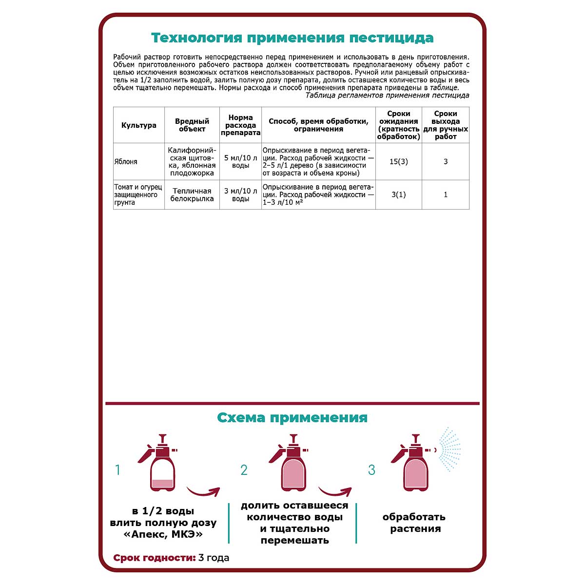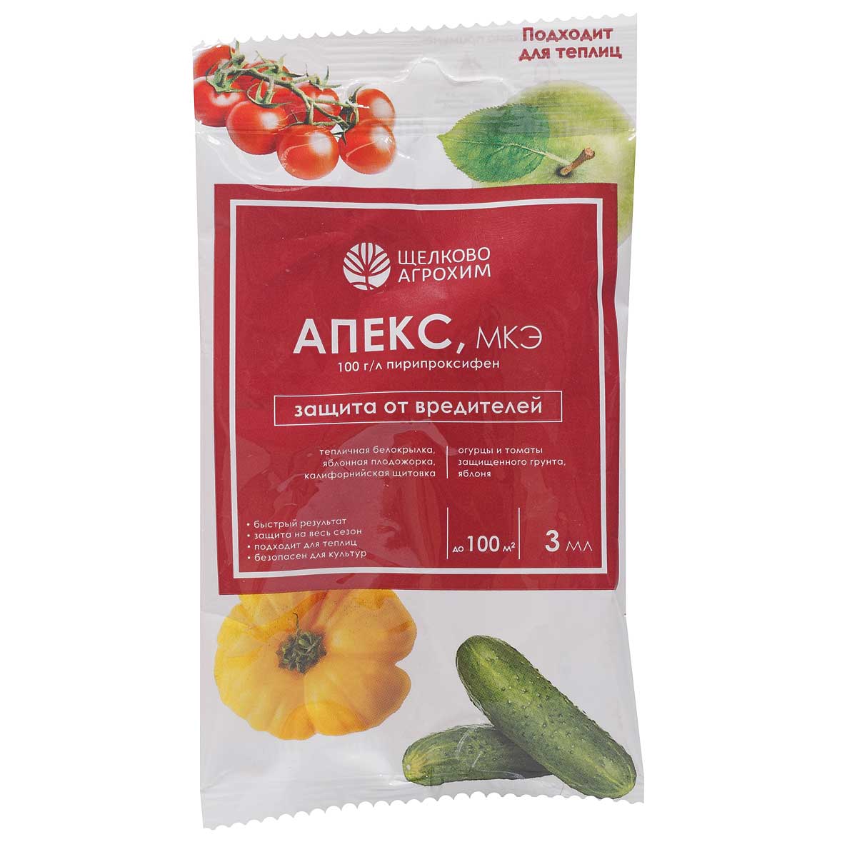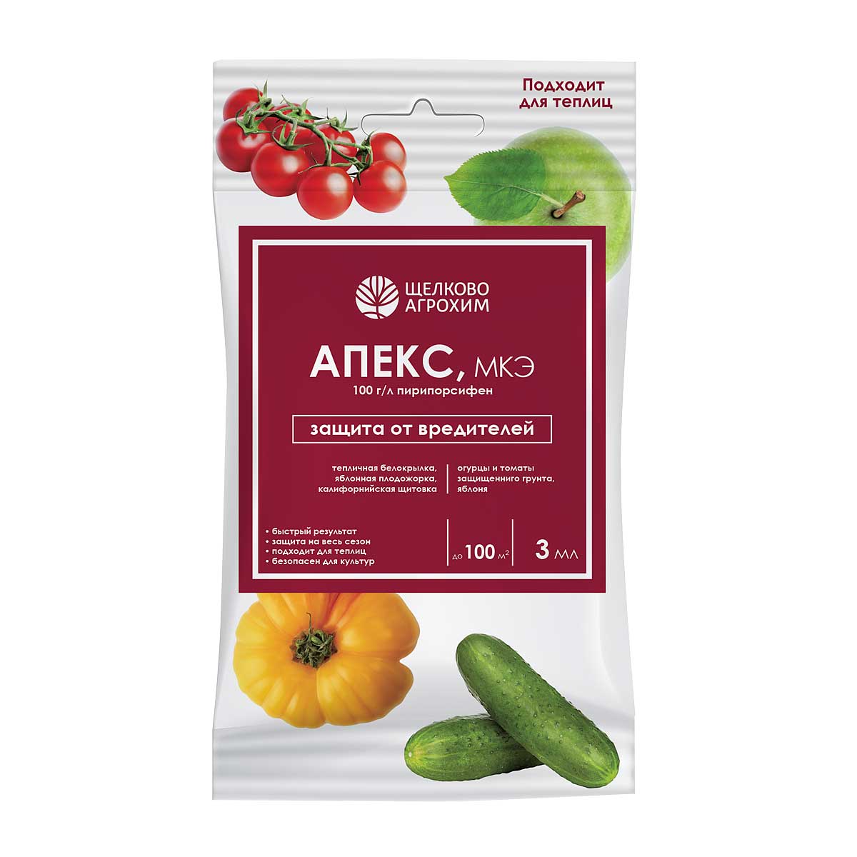 Препарат «Апекс, МКЭ» на основе пирипроксифена обладает контактно-кишечным действием и влияет на физиологические процессы насекомых. Проникая в организм вредителя, активное вещество препарата нарушает гормональный баланс, вызывает стимуляцию роста личинки, не позволяя перейти ей в стадию образования взрослой особи, что приводит к ее гибели. Взрослые особи, которые подвергаются воздействию инсектицида, не способны отложить жизнеспособные яйца и становятся бесплодными. «Апекс, МКЭ» малотоксичен для полезных насекомых, экономичен в применении, уничтожает тепличную белокрылку, калифорнийскую щитовку, яблонную плодожорку др. вредителей. Препарат безопасен при применении на тепличных культурах и его можно использовать на ранних стадиях развития растений.