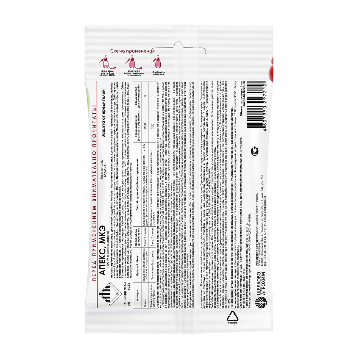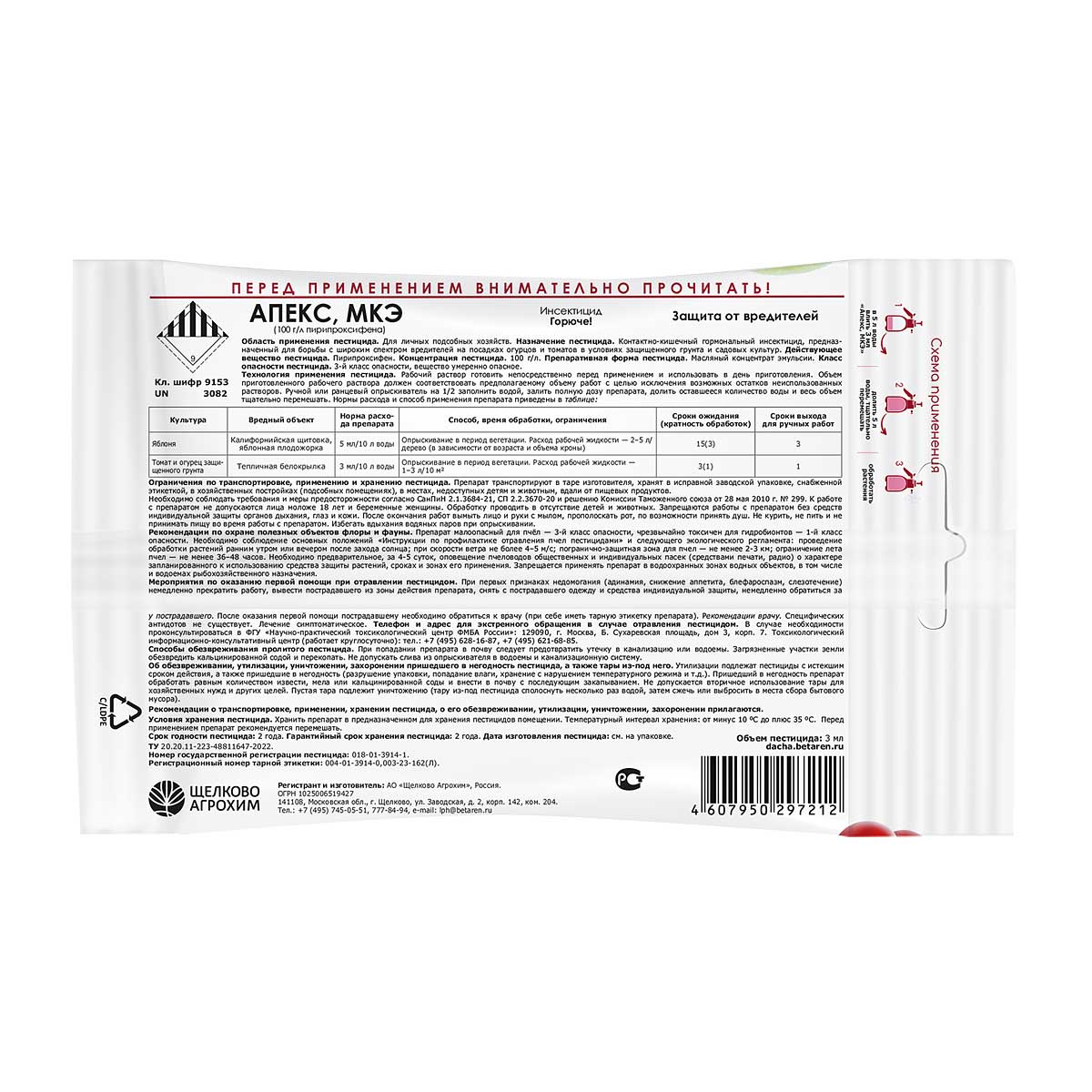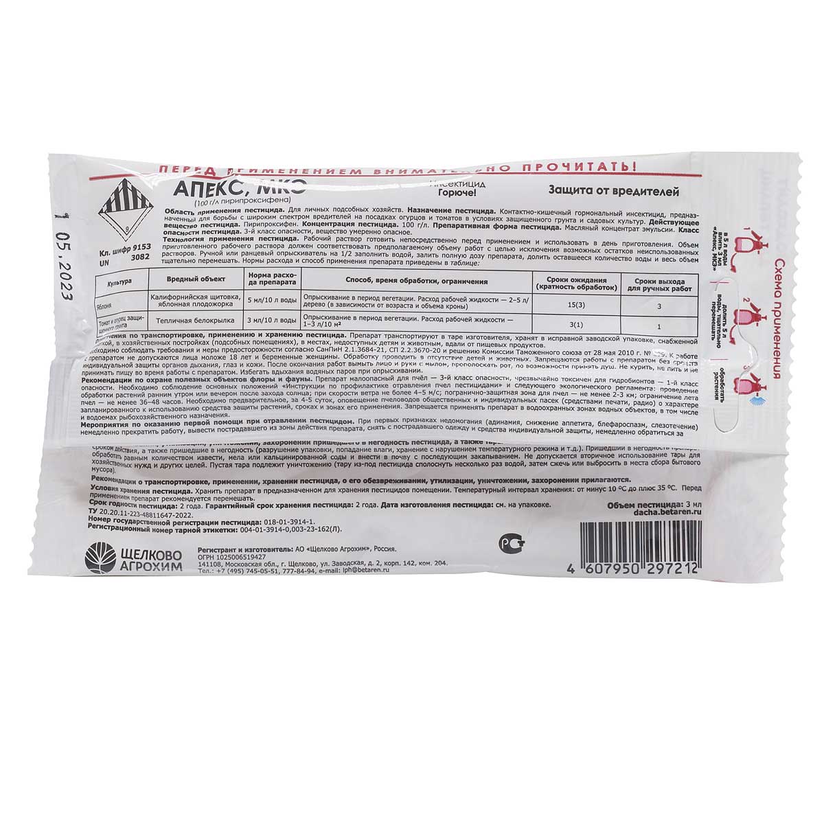 Препарат «Апекс, МКЭ» на основе пирипроксифена обладает контактно-кишечным действием и влияет на физиологические процессы насекомых. Проникая в организм вредителя, активное вещество препарата нарушает гормональный баланс, вызывает стимуляцию роста личинки, не позволяя перейти ей в стадию образования взрослой особи, что приводит к ее гибели. Взрослые особи, которые подвергаются воздействию инсектицида, не способны отложить жизнеспособные яйца и становятся бесплодными. «Апекс, МКЭ» малотоксичен для полезных насекомых, экономичен в применении, уничтожает тепличную белокрылку, калифорнийскую щитовку, яблонную плодожорку др. вредителей. Препарат безопасен при применении на тепличных культурах и его можно использовать на ранних стадиях развития растений.