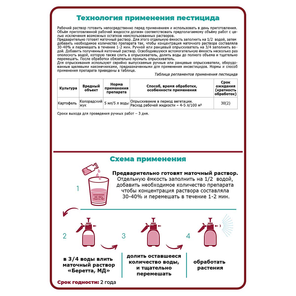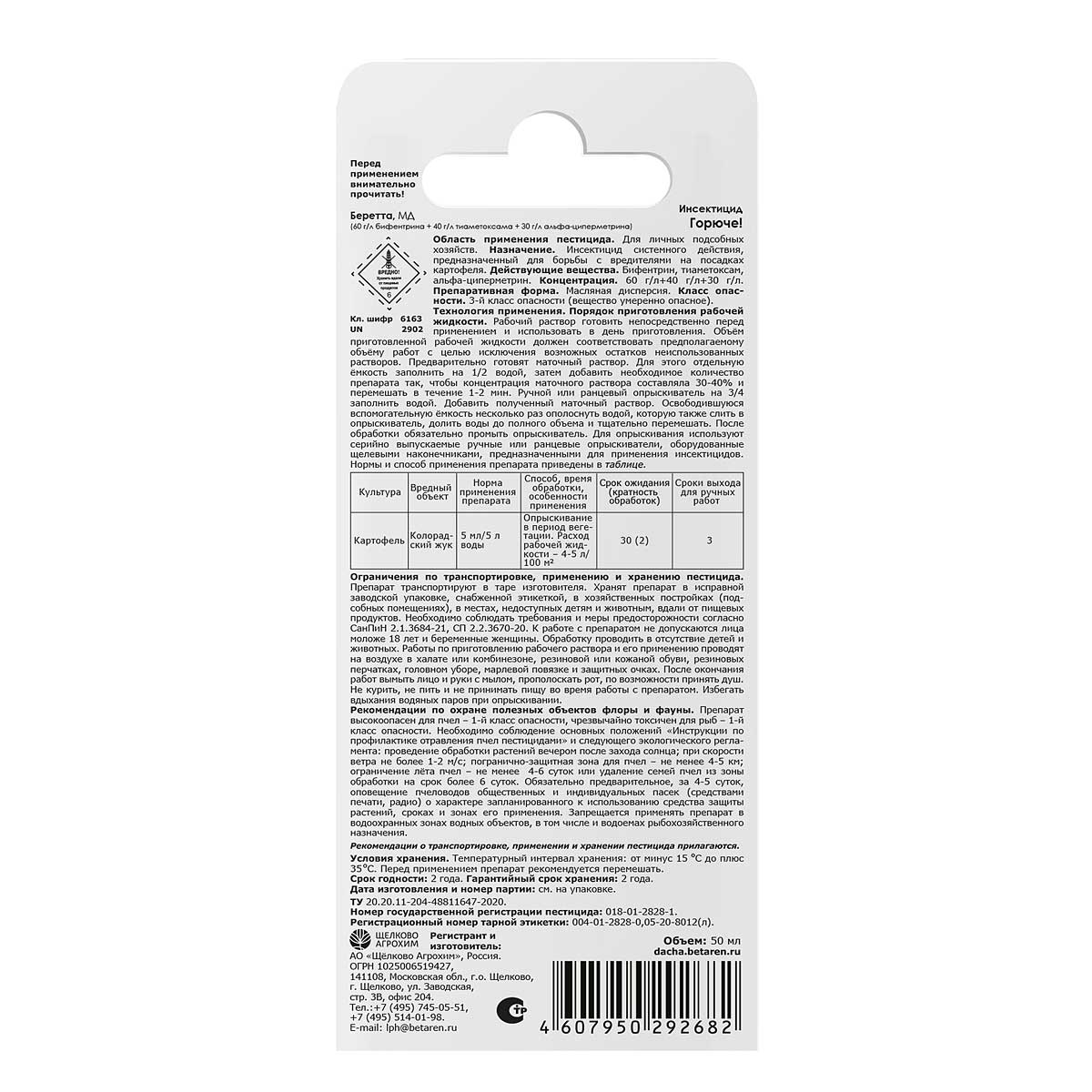 Инсектицид «Беретта, МД» – один из самых современных и эффективных препаратов от колорадского жука. Препарат эффективно воздействует на все стадии развития насекомых, включая обитающих на обратной стороне листа и скрытноживущих. В составе препарата три действующих вещества, каждое из которых за счёт различия свойств действует на вредителей по-своему: если вредитель устоит против одного компонента, то гибель наступит от двух других. После обработки раствор легко проникает внутрь растения и отлично закрепляется на теле насекомого, усиливая контактное действие. «Беретта, МД» устойчив к смыванию осадками и испарению с обработанной поверхности. Всё это обеспечивает длительный период защиты картофельных посадок – до 35 дней.