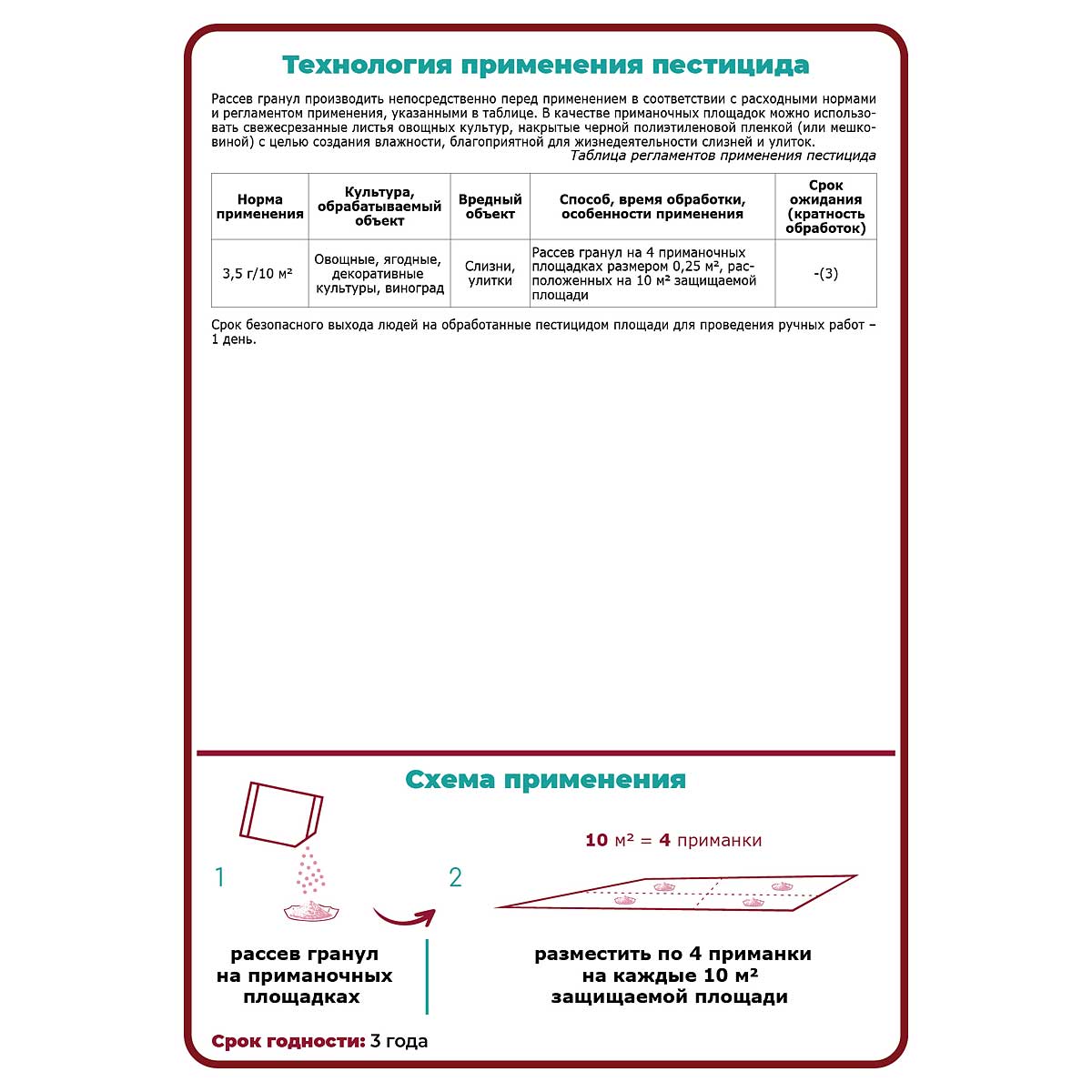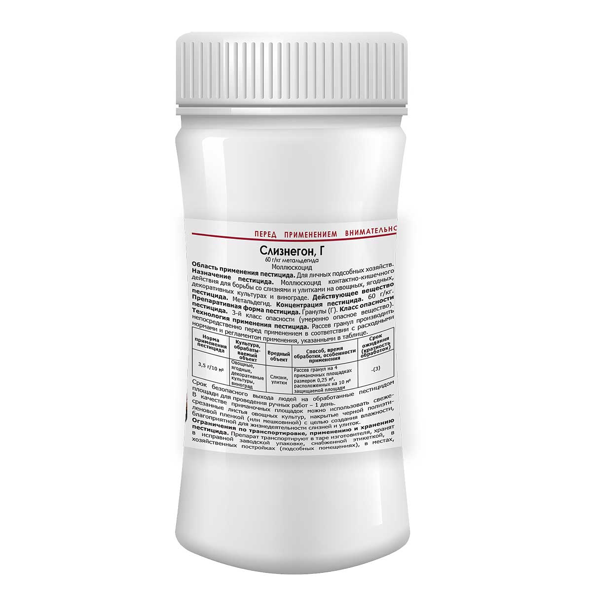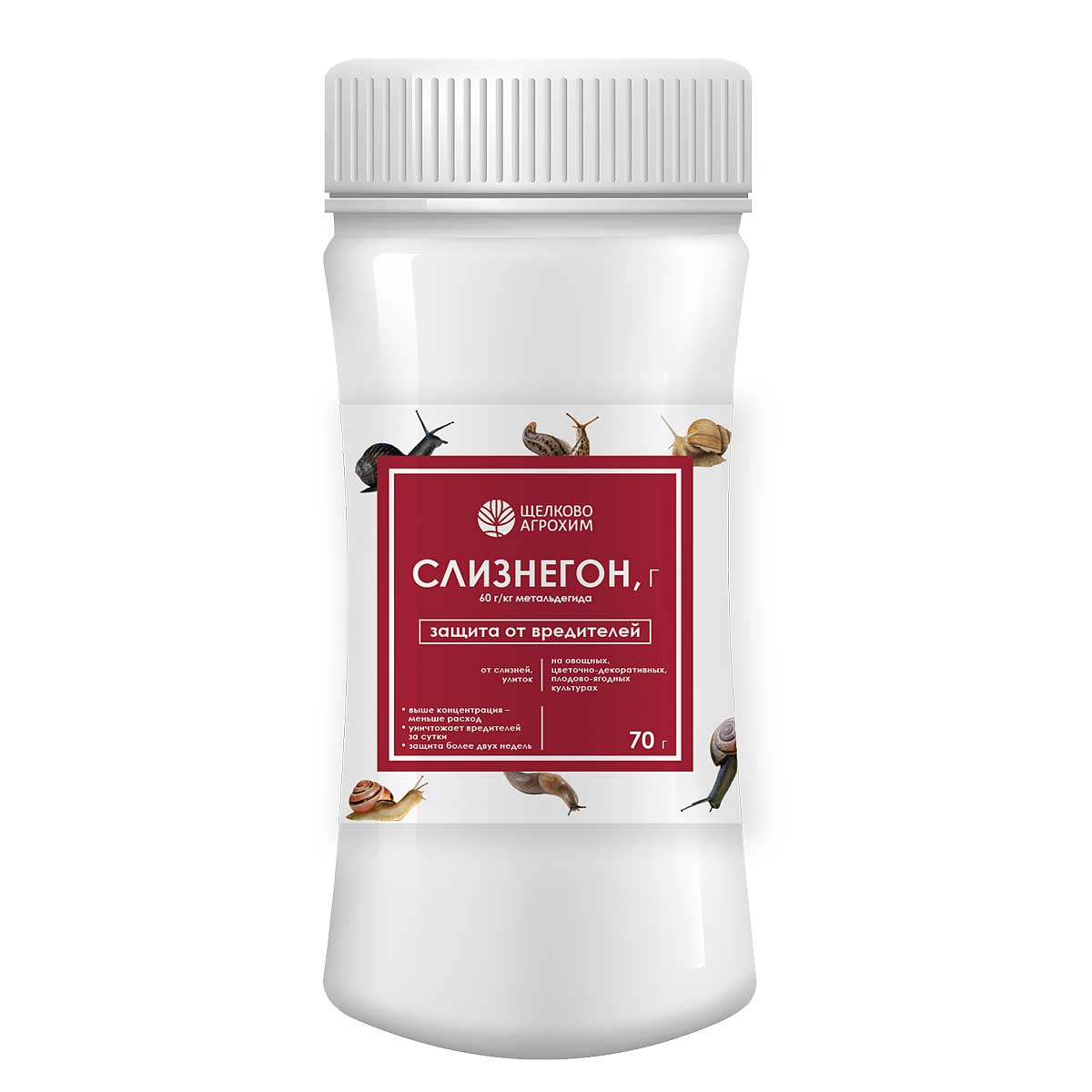 «Слизнегон, Г» с удвоенной концентрацией матальдегида предназначен для борьбы со слизнями и улитками на овощах, ягодах, декоративных культурах и винограде. Препарат выпускается в виде гранул, которые нужно равномерно рассыпать в местах частого скопления улиток, между грядками, вокруг растений или заложить в ловушки. Действие препарата начинается через несколько минут после контакта с вредителями, и в течение нескольких часов они погибают. Метальдегид попадает в организм вредителей двумя путями: через кожные покровы после соприкосновения с гранулами и с пищей. «Слизнегон, Г» повреждает слизистые клетки в пищеварительном тракте, после чего моллюски теряют жидкость, высыхают и умирают.
