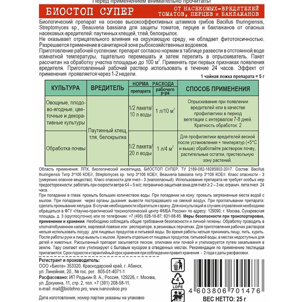 Инсектицид Биостоп Супер от вредителей на томате — высокоэффективный препарат, который защищает растения от различных насекомых. Средство не оказывает негативного воздействия на окружающую среду. Чтобы воспользоваться им, требуется подготовить рабочую суспензию в соответствии с инструкцией. Препарат разводиться в отстоянной воде, тщательно перемешивается и переливается в опрыскиватель. Воспользоваться раствором рекомендуется при появлении первых признаков вредителей. Это позволит своевременно избежать повреждения растений и обеспечить их устойчивый, активный рост.