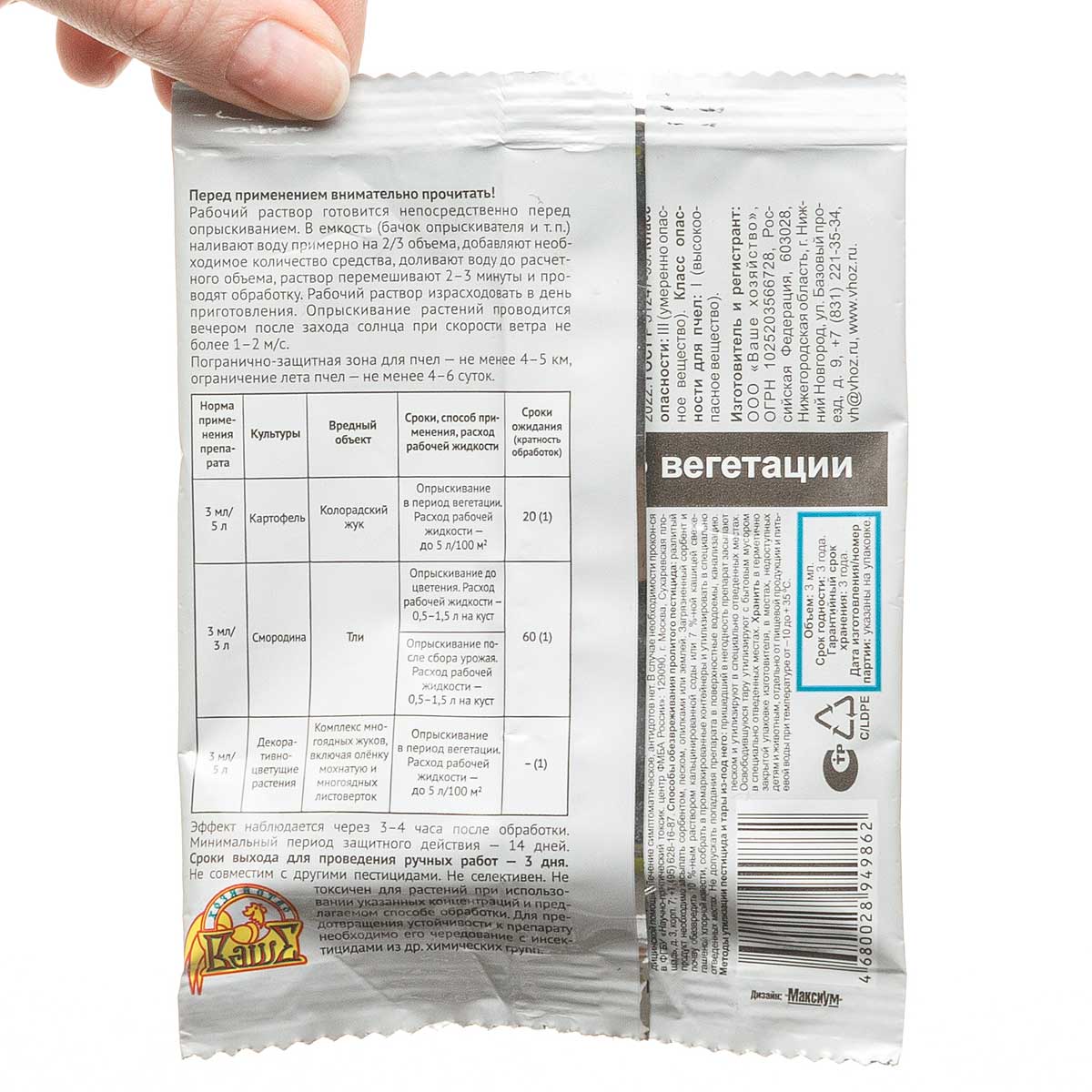 Уничтожает колорадского жука и других злостных листоедов – эффект через 3-4 часа после обработки! Картофельные кусты опрыскивают раствором в период вегетации. Ягодные кустарники (смородину, крыжовник и другие), а также декоративные растения от многоядных жуков, в том числе листовёрток и олёнки мохнатой, обрабатывают до цветения.