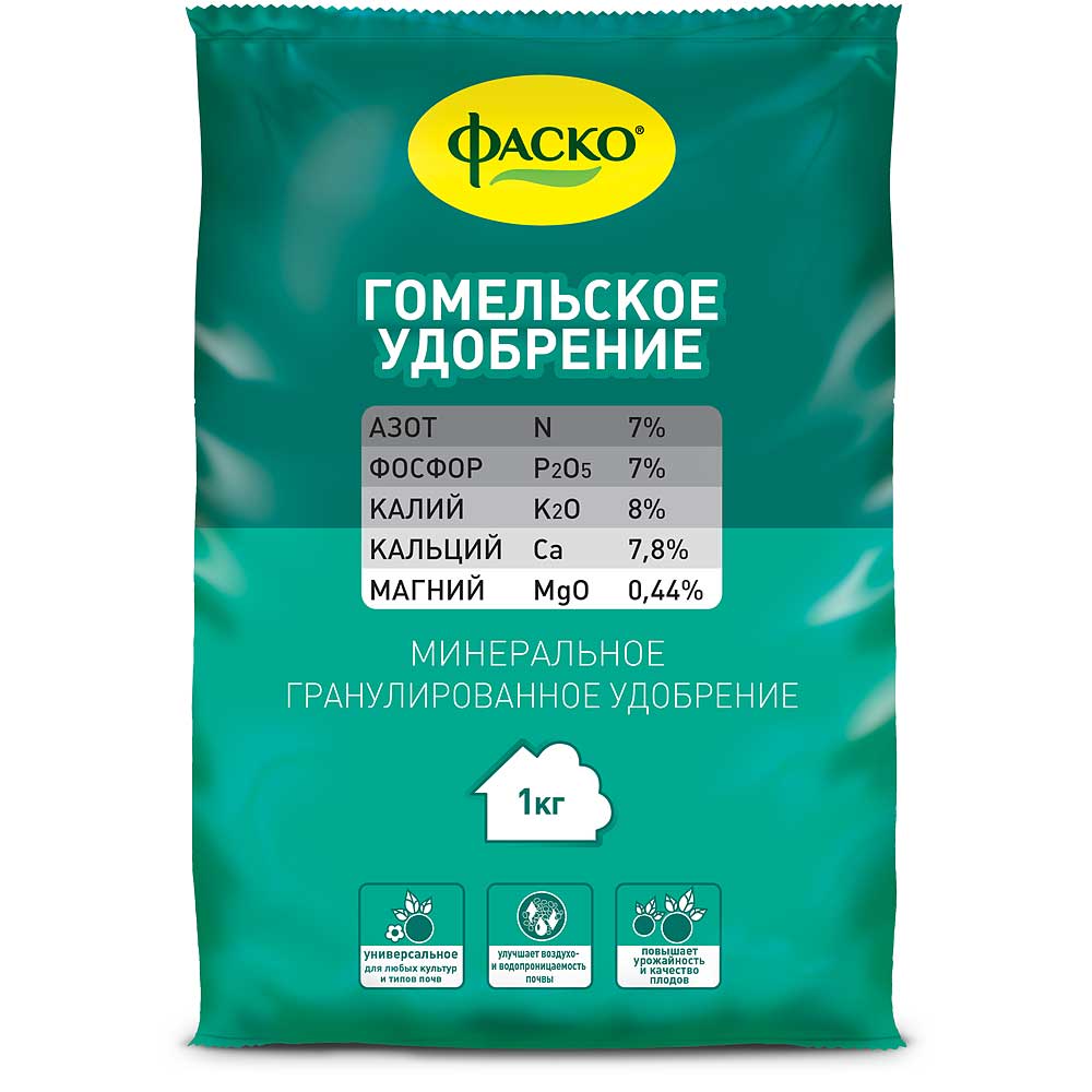Фаско Гомельское – минеральное азотно-фосфорно-калийное удобрение пролонгированного действия. Применяется для основного внесения и корневой подкормки всех культур, выращиваемых на любых типах почв. Препарат улучшает аэрацию почвы, повышает ее плодородность, предотвращает деформацию вегетативных органов, повышает иммунитет растений.