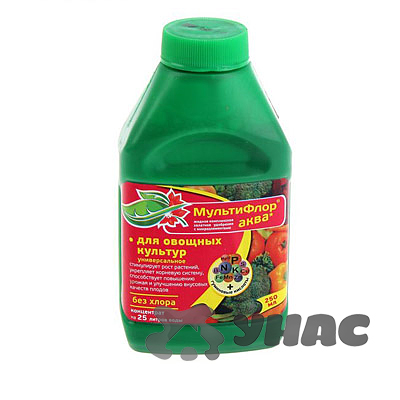 «Мультифлор Аква» — комплексное минеральное удобрение с микроэлементами и гуминовыми кислотами для подкормки овощных культур (томаты, перцы, баклажаны, огурцы, капуста, морковь и др.).