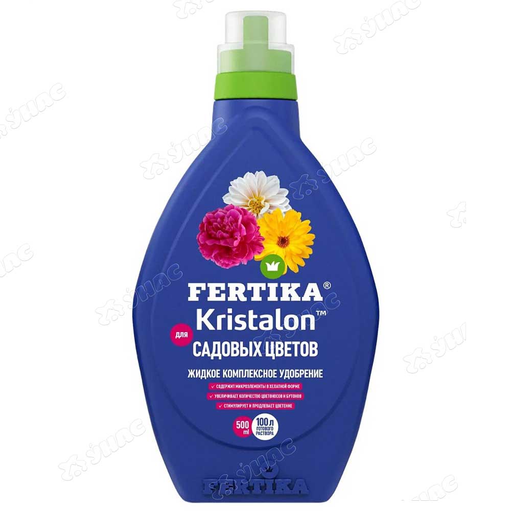 Удобрение Фертика Кристалон для садовых цветов, 500 мл. Удобрение Фертика Кристалон для садовых цветов - жидкий комплексный состав, богатый полезными веществами и микроэлементами. Способствует улучшению интенсивности окраски листьев и цветков, продолжительному цветению. Перед применением средство разбавляется в соотношении 1:100. Применение: содержимое 1/4 колпачка (10 мл) развести в 1 литре воды.- Удобрение для садовых цветов- подкормка для садовых цветов- стимулятор для садовых цветов.