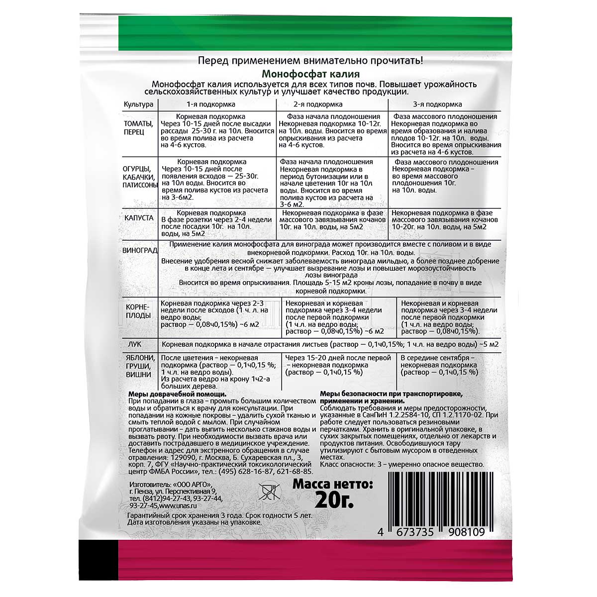 Монофосфат калия является одним из самых концентрированных фосфорнокислых удобрений. При использовании монофосфата калия в декоративном растениеводстве ускоряется наступление и продлевается цветение цветочных растений, его применение способствует лучшему вызреванию побегов и перезимовке декоративных деревьев и кустарников. Предназначено для питания растений в защищённом и открытом грунте при внесении с поливной водой, а также для внекорневых подкормок. Фосфорно-калийное водорастворимое удобрение для подкормок любых культур. Минеральное удобрение предназначено для жидких корневых и некорневых подкормок культур в открытом и защищенном грунте.