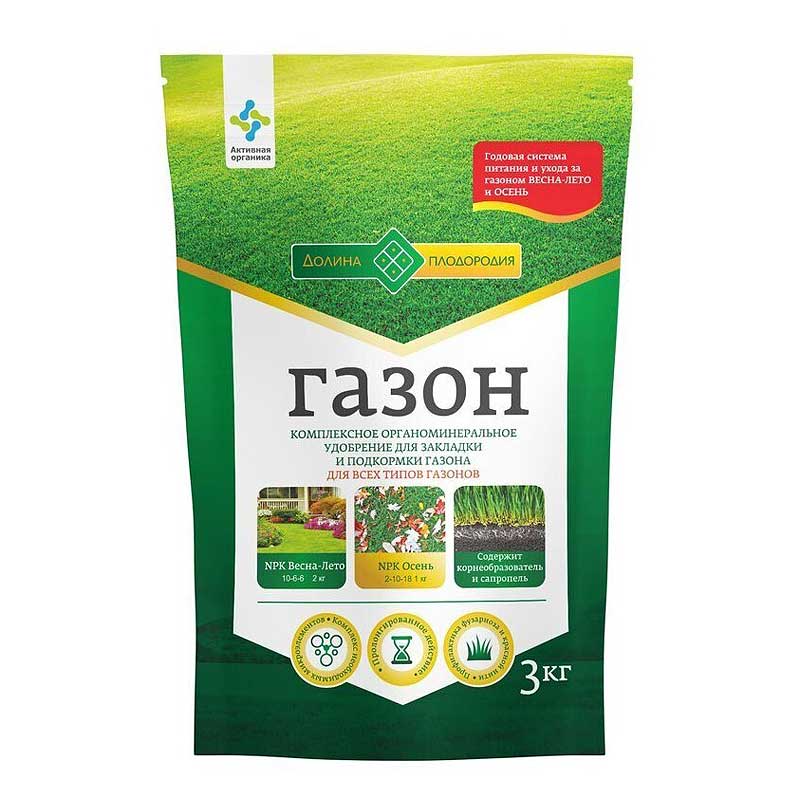 Удобрение органо-минеральное Долина плодородия "Газон" 3 кг ‒ комплексное гранулированное органоминеральное удобрение пролонгированного действия для различных типов газонов. Содержит специальные комплексы для подкормки газонов в период весна-лето и для осенней подкормки газонов. В составе удобрения содержатся макро- и микроэлементы в сбалансированном состоянии и в легкоусвояемой форме для растений. Гуминовые соединения способствуют полноценному развитию газона, сохранению устойчивого зеленого цвета травы на весь период вегетации. Окутав гранулы корешками, травы потребляют минеральные элементы постепенно. В органоминеральных соединениях усвоение полезных веществ возрастает до 98%. Они сохраняются в почве длительное время, продолжая свое действие два года. Обеспечивает перезимовку и хорошую сохранность газона. Длительное действие удобрения обеспечивает яркую зеленую окраску газона, густоту травяного покрова на протяжении теплого сезона и укрепляет иммунитет ко многим болезням.