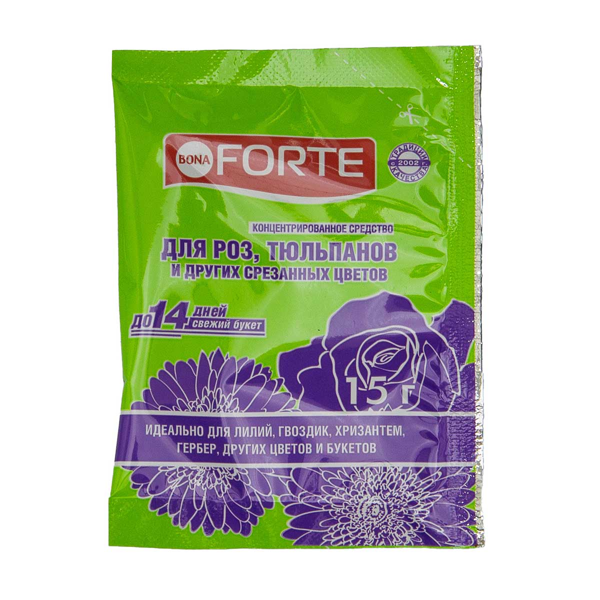 Концентрат создан лабораториями Bona Forte для продления жизни срезанных цветов: роз, тюльпанов, гвоздик, гербер, хризантем, ирисов и других цветов.