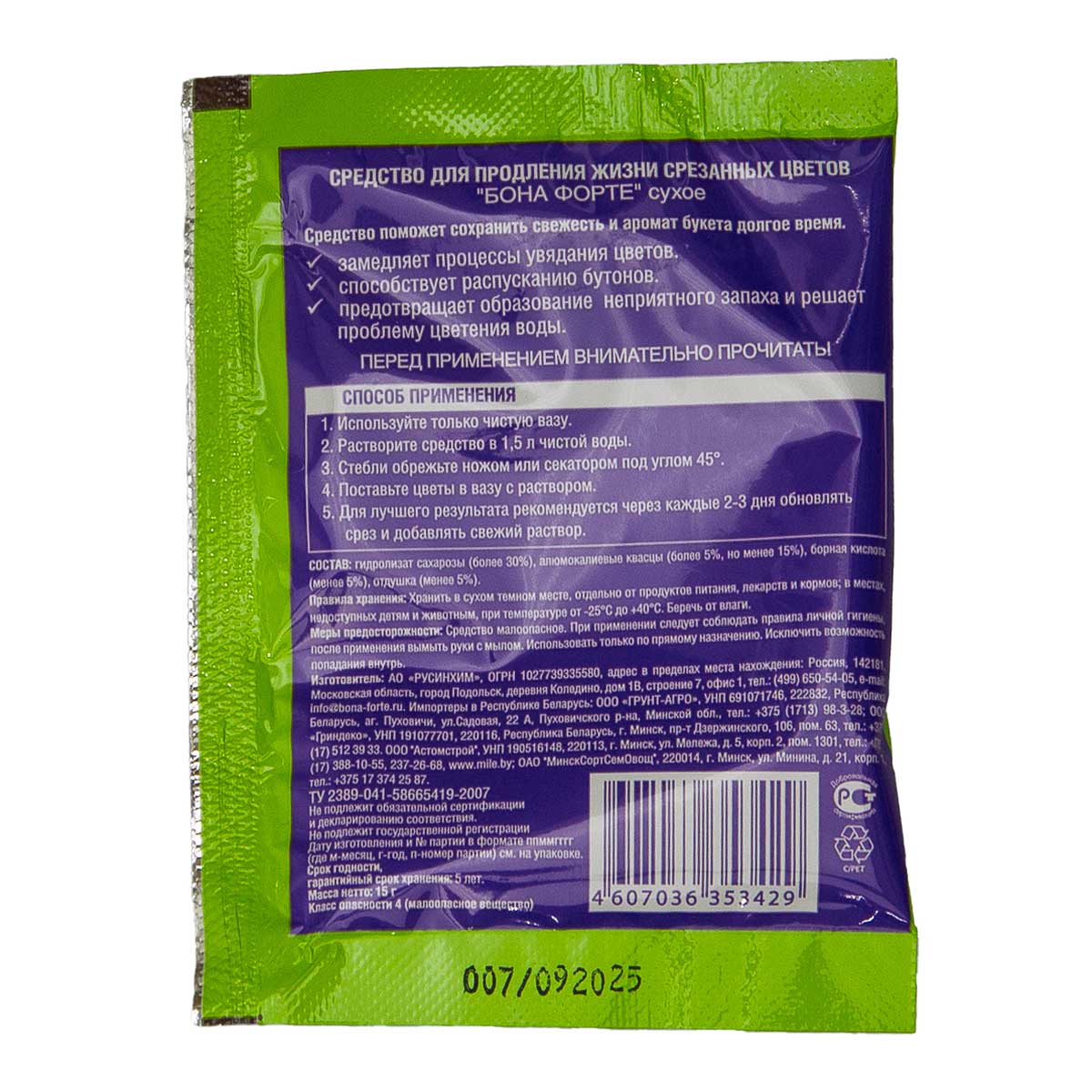 Средство содержит полный комплекс веществ, помогающих сохранить аромат и свежесть букета на долгое время, предотвращающих образование неприятного запаха, способствующих распусканию бутонов.